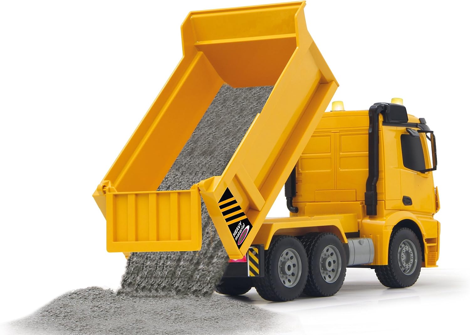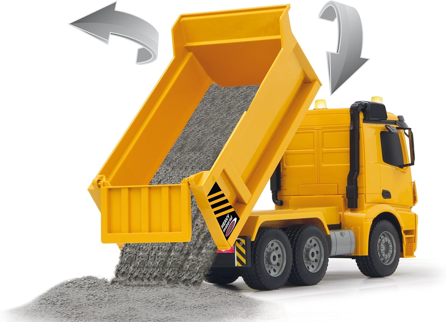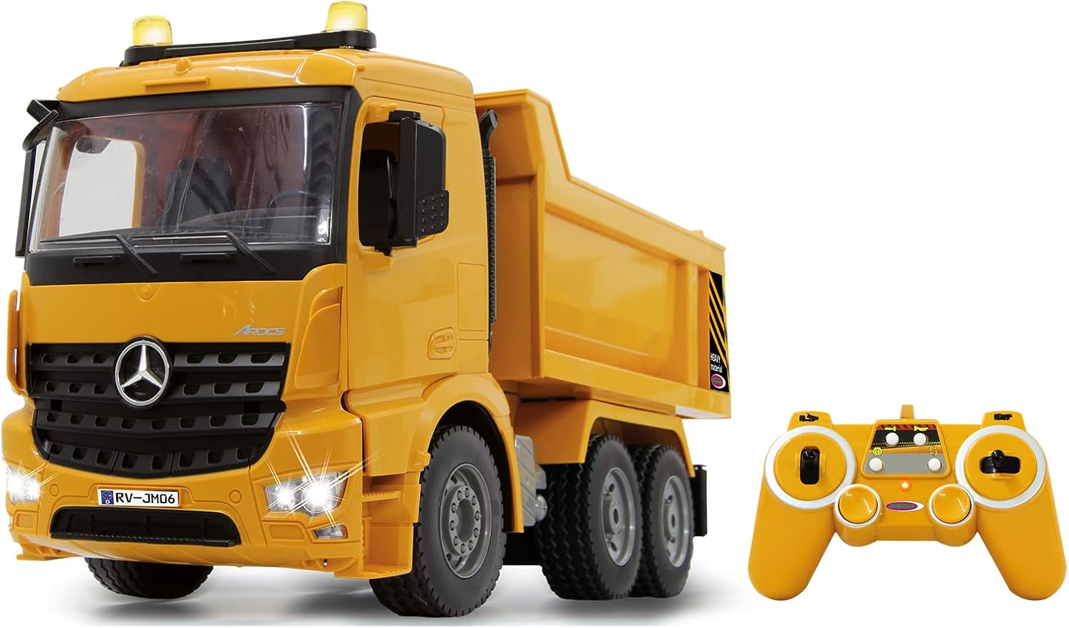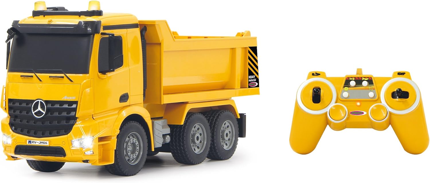 JAMARA 404940 – Самосвал Mercedes-Benz Arocs 2.4 GHz – Обръщане нагоре/надолу, реалистичен звук на двигателя, клаксон, предупредителен звук за движение на заден ход, задвижване на 4 колела, жълти LED светлини, програмируеми функции
