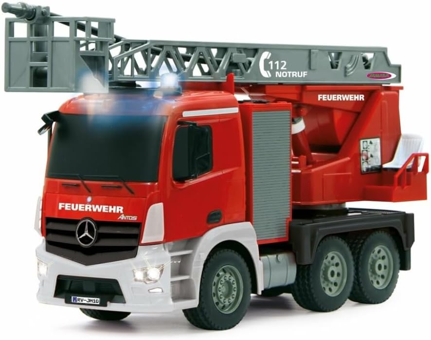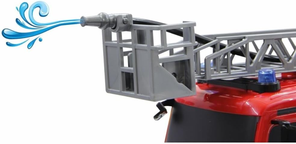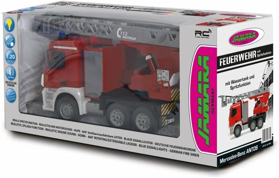 Jamara 404960 - Въртяща се стълба за пожарна кола, 1:20 Mercedes Antos 2.4G, немска сирена със сини LED сигнални светлини, контейнер за вода 420 мл, функция за истинско пръскане, програмируеми функции, задвижване на 4 колела