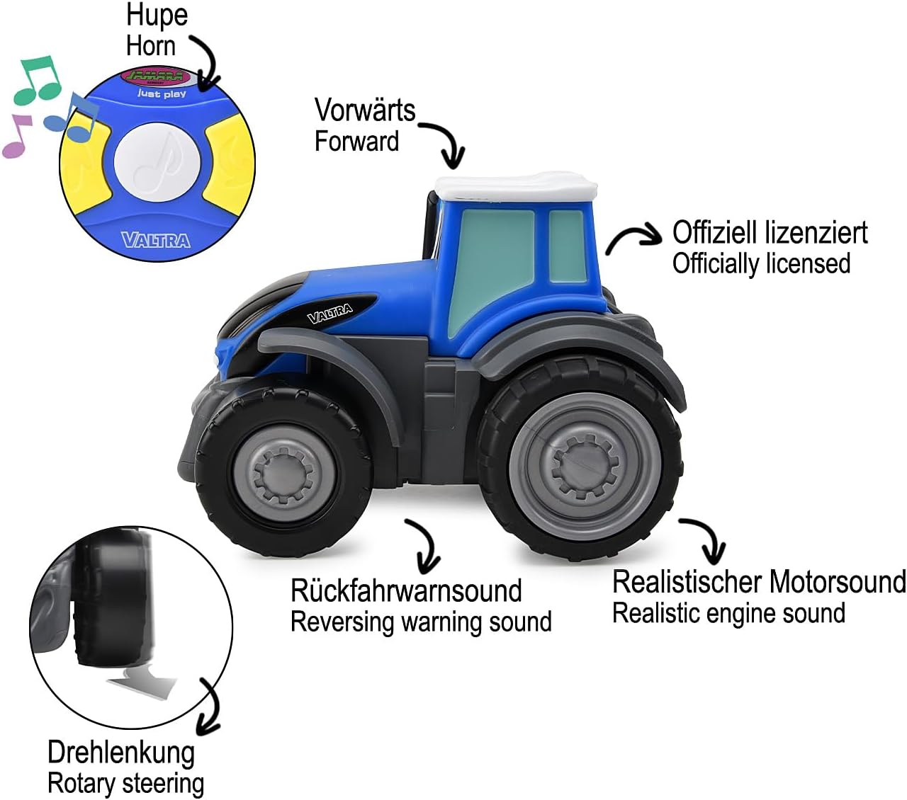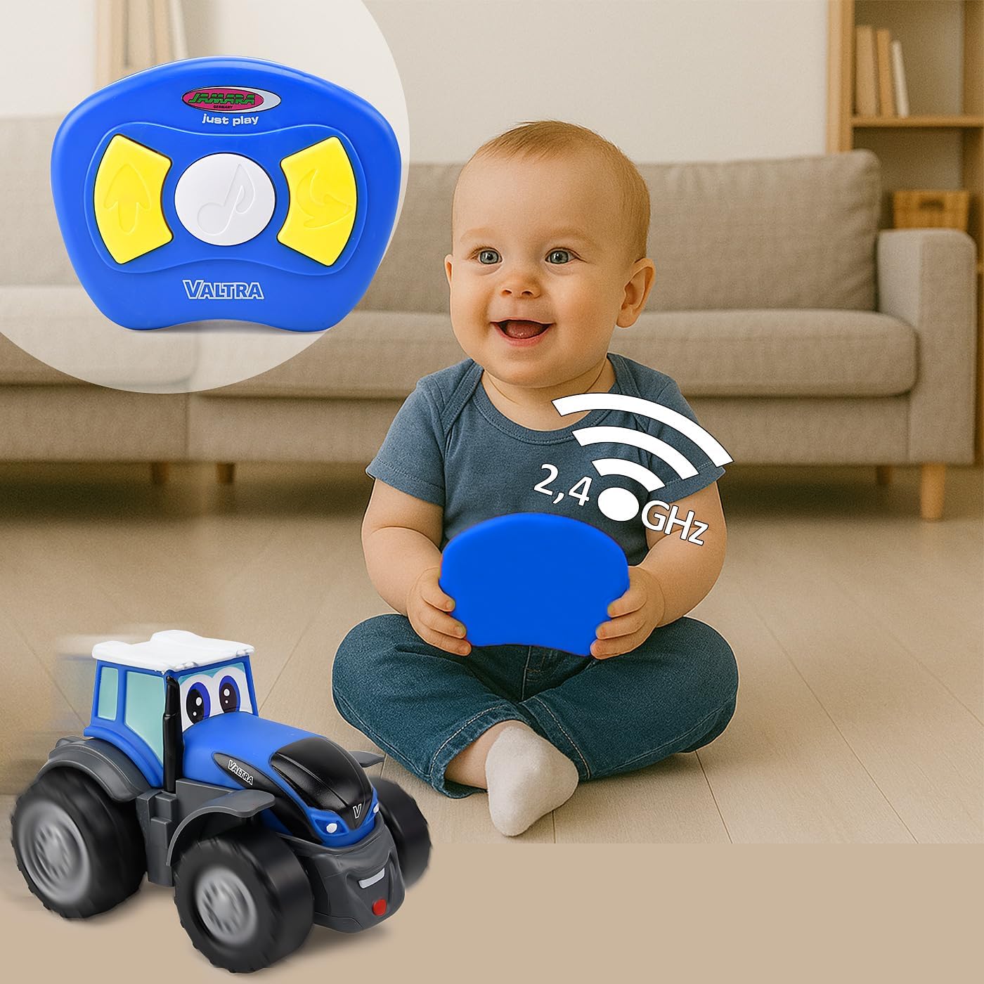 Серията My First RC от JAMARA е за най-малките фенове на земеделието. Първото дистанционно управлявано превозно средство винаги е нещо много специално и кара очите на всички деца да греят. Малкият трактор Valtra с приятелското си лице е идеален за деца над 2 години. Елегантното дистанционно управление пасва ергономично в малките ръце и затова е много лесно за употреба. Безопасната честота от 2,4 GHz позволява едновременното движение на няколко трактора. Управление на завиване напред и назад с големи бутони отстрани и голям клаксон в средата, така че малкият трактор да се чува навсякъде. Ето го и сладкият трактор Valtra и за да не се случи нищо дори при движение на заден ход, се чува предупредителен звук - точно като истински голям трактор. За нови приключения, сега забавлението за малките фермери идва на подложките за игра в детската стая.