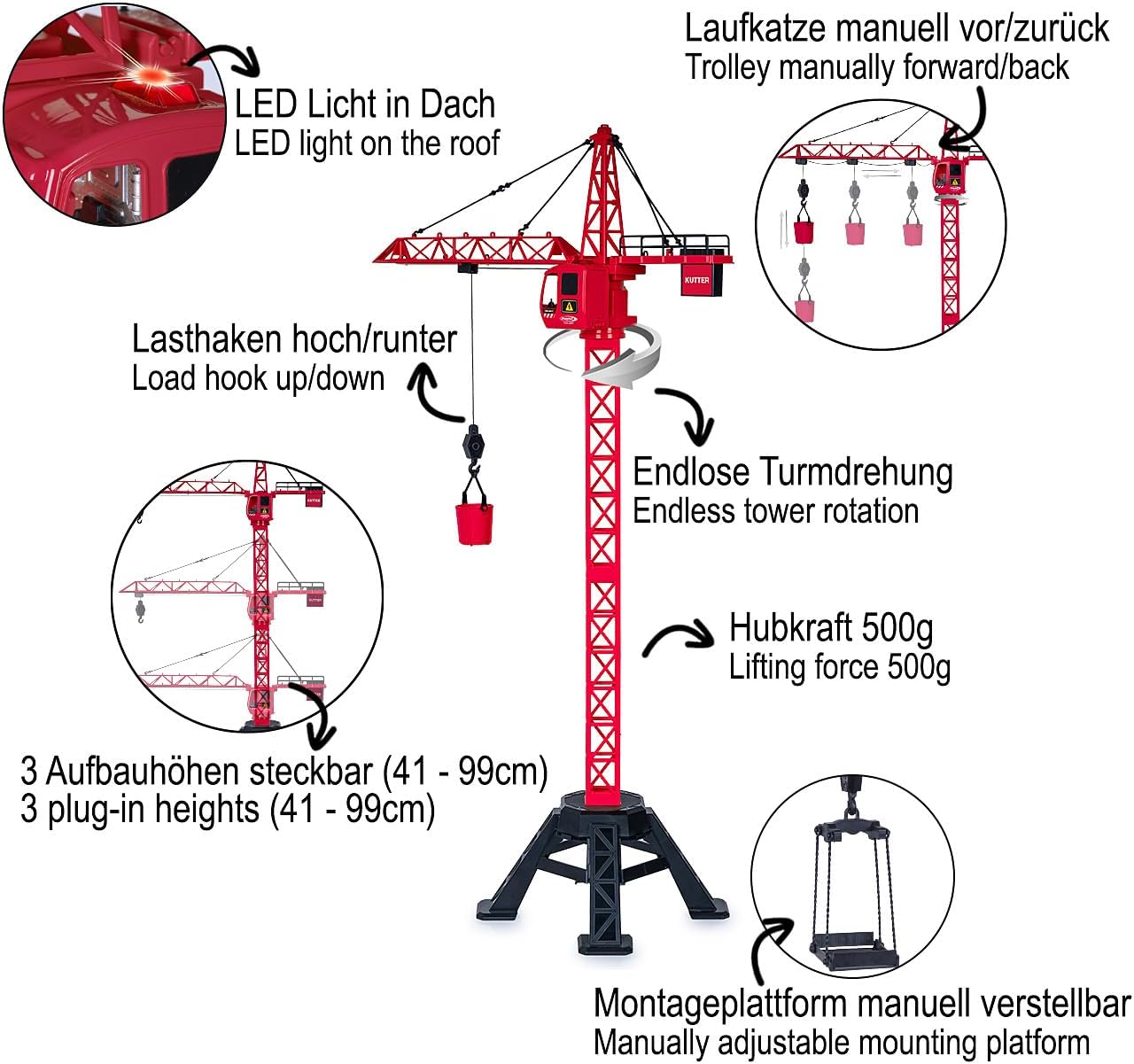 Кулокранът Kutter XL 99 IR е перфектната играчка за строителната площадка в детската градина. Този официално лицензиран модел не само изглежда страхотно, но и носи много забавление. Отворената кабина позволява на играчка да влезе, а с LED светлините на покрива, кранът наистина оживява. Кранът е оборудван с инфрачервено дистанционно управление, с което куката за товарене и въртенето на кулата могат лесно да се контролират. Това позволява на крана да повдига и спуска товари - с впечатляваща товароносимост от 500 g и плъзгащ се съединител за безопасна работа. Количката може лесно да се дърпа напред-назад на ръка, а кранът може да се върти безкрайно, така че всяко място на конструкцията може да бъде достигнато без усилие. С 3-те различни височини на монтаж, кранът е готов и гъвкав за всяка строителна площадка. Сменяемата батерия гарантира, че кранът е готов за употреба отново и отново, а лесният монтаж прави монтажа лесен. С включен товарен носач за повдигане и спускане на по-големи материали и ръчното регулиране на монтажната платформа, кранът е добре оборудван за всеки строителен проект. Кулокранът с резачка XL 99 IR е перфектният подарък за малки строителни мениджъри, които искат да се справят енергично.