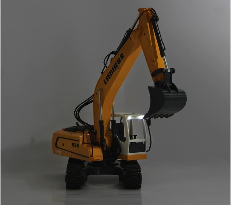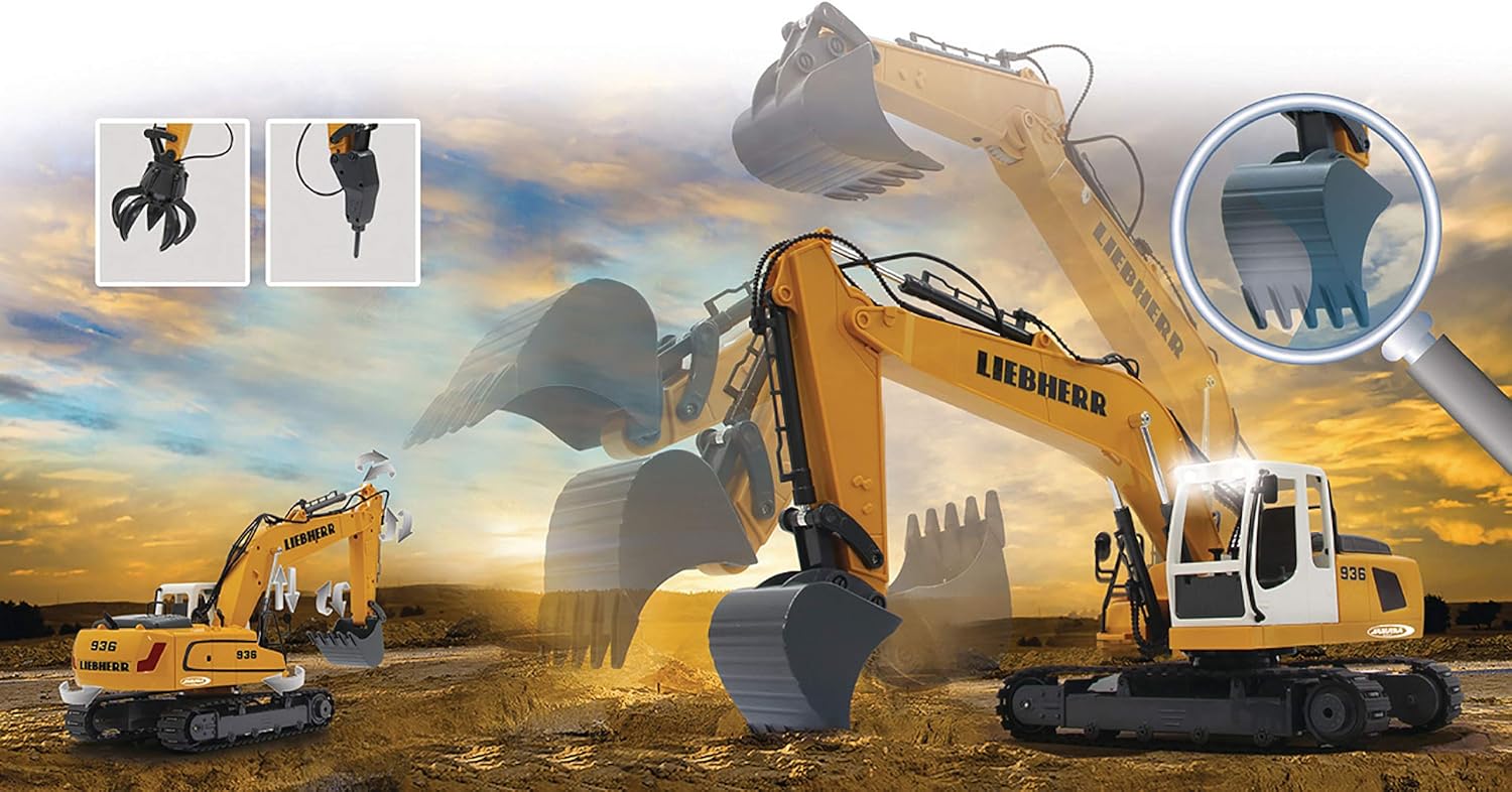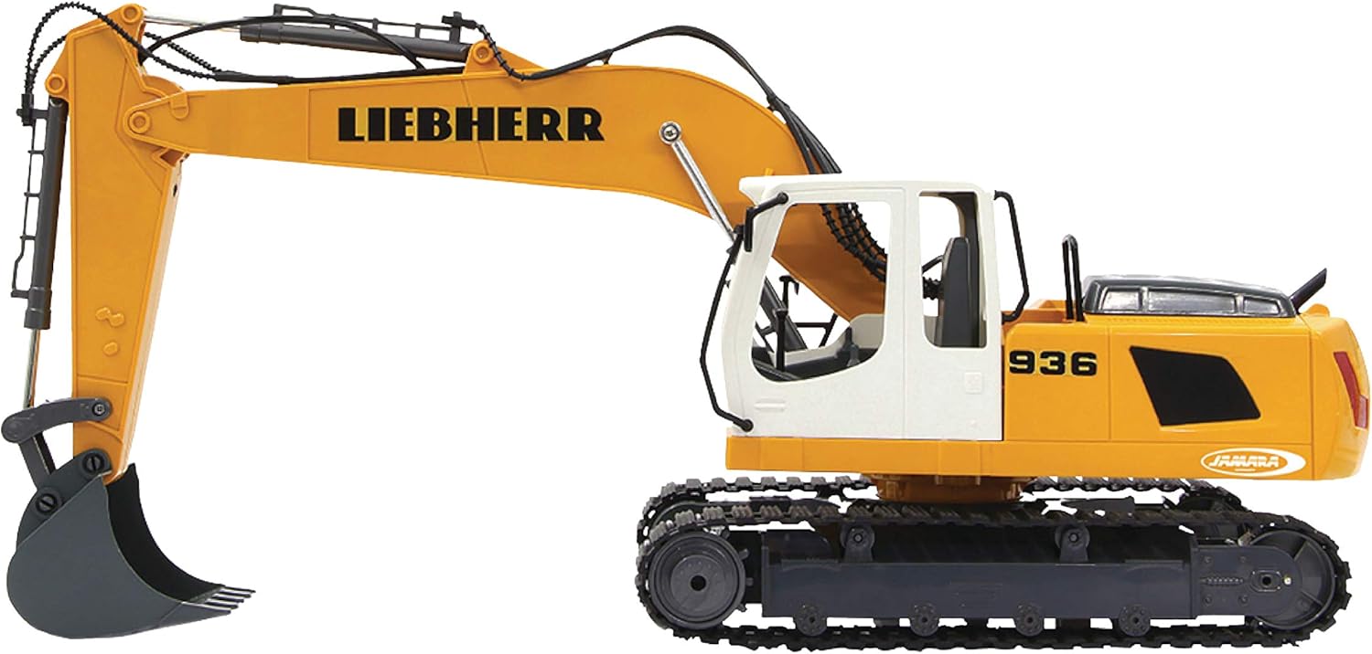 Jamara Liebherr R936 405060 Багер 1:20 2.4G Реалистични функции (разтоварване/зареждане), всяка става може да се управлява индивидуално Завъртане на кулата на 660°, метална лопата, звук на двигателя, клаксон, предупредителен звук за заден ход