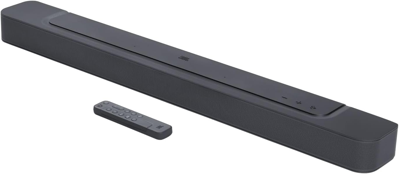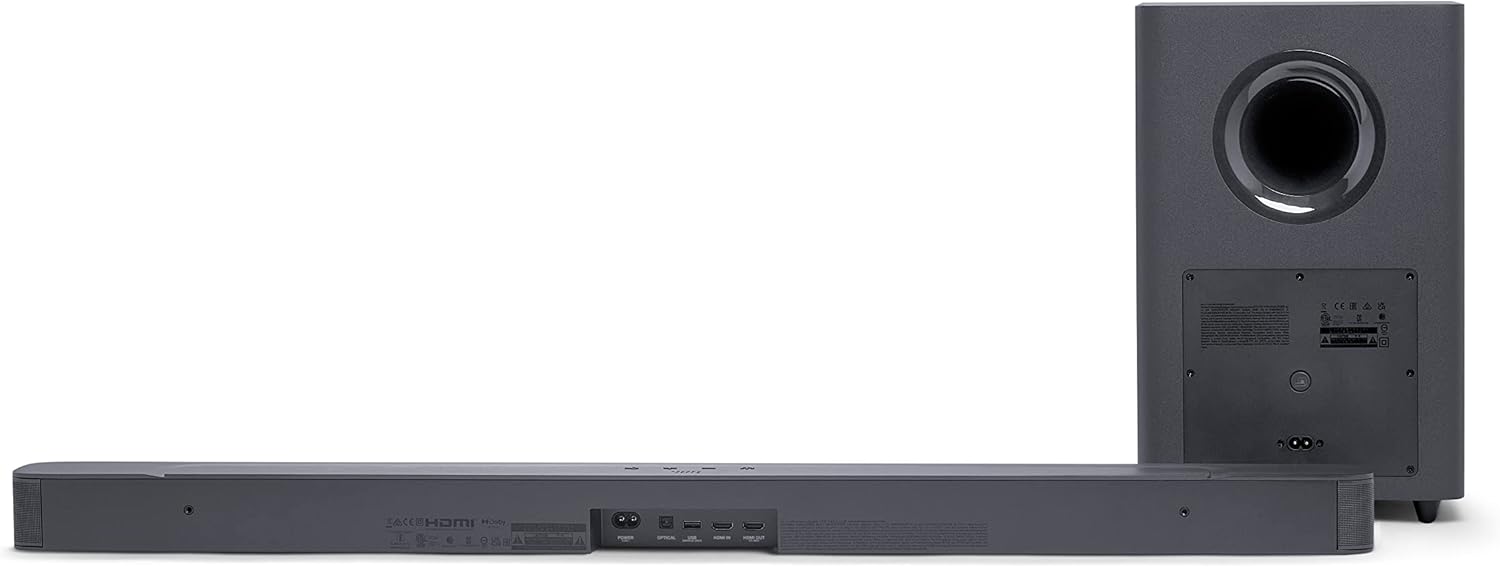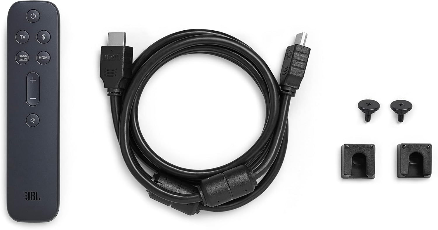 • Съдържание на кутията: 1 x JBL саундбар в черно, 1 x безжичен субуфер, 1 x дистанционно управление с батерии, 1 x захранващ кабел, 1 x HDMI кабел, 1 x скоба за стенен монтаж, инструкции и информационен лист за безопасност
