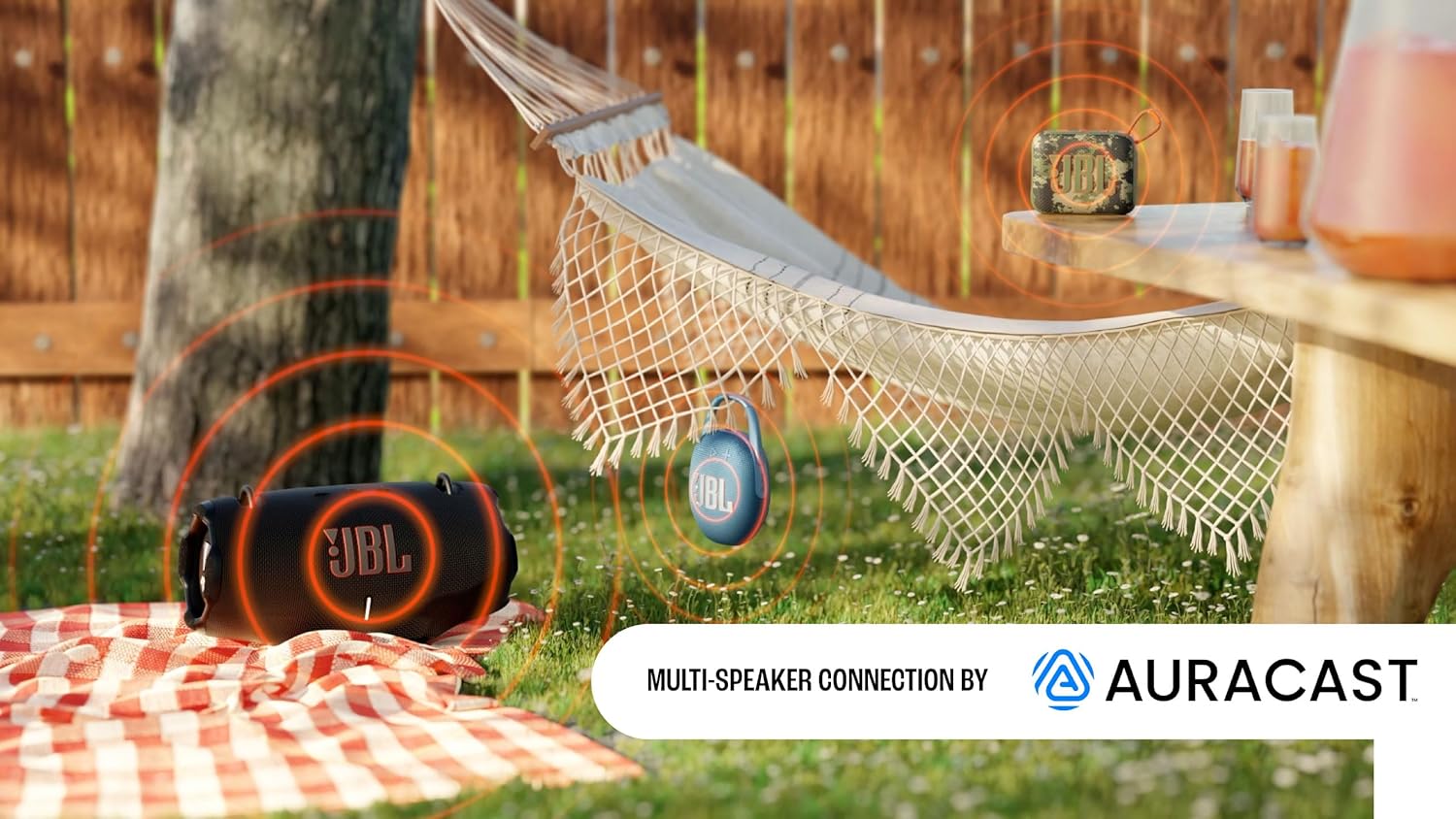 • Звуковата кутия е водоустойчива и прахоустойчива с IP67 и се превръща в идеалния спътник на следващото къмпингуване с карабинера. За по-големи групи, свържете няколко JBL високоговорителя безжично към Auracast.