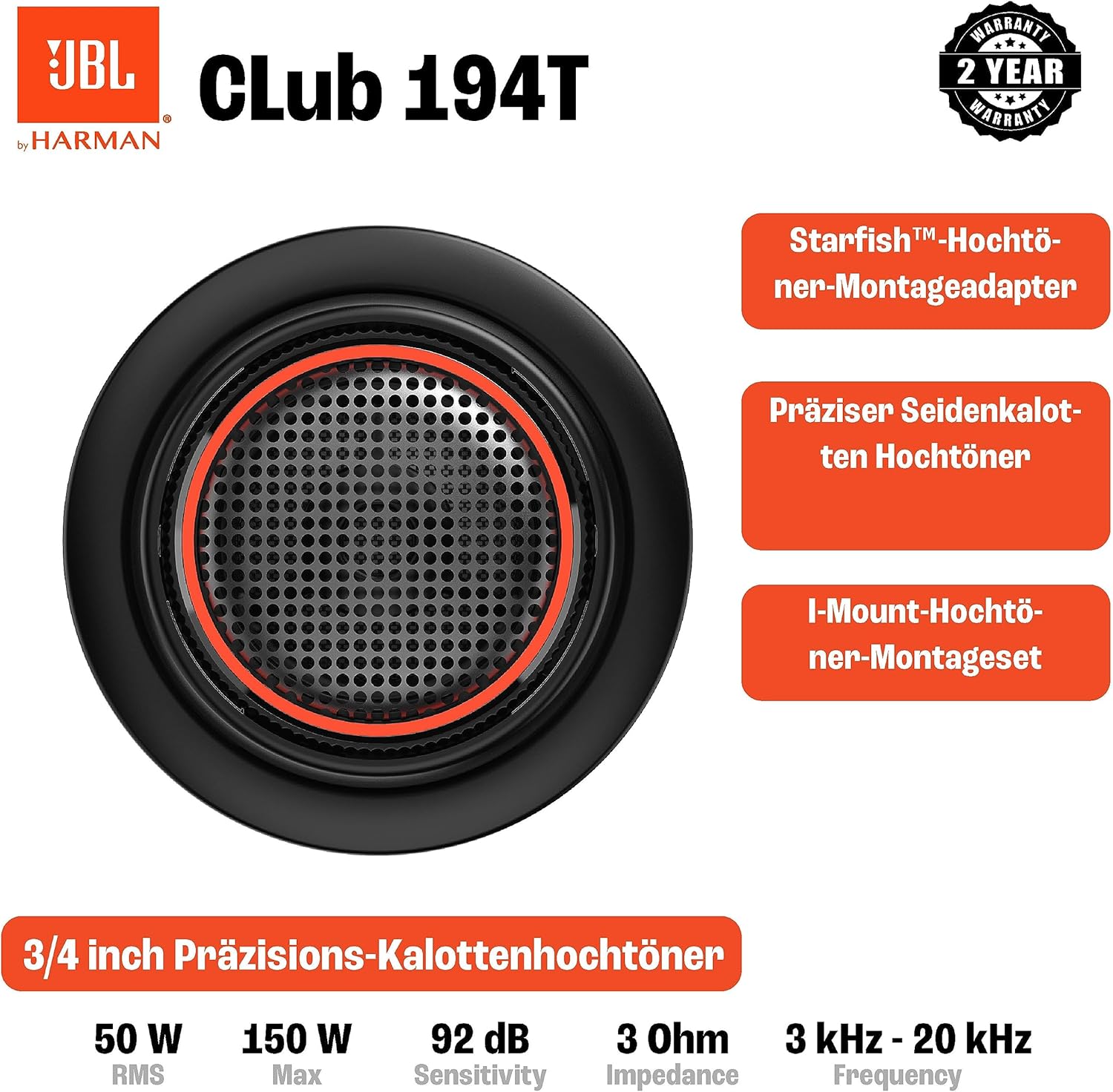 • Надстройте автомобилната си озвучителна система с новия JBL Tweeter Club 194T Gen 3: Изпитайте JBL Signature Sound и се насладете на висококачествен JBL звук в движение с тези 20 мм компонентни високочестотни говорители.