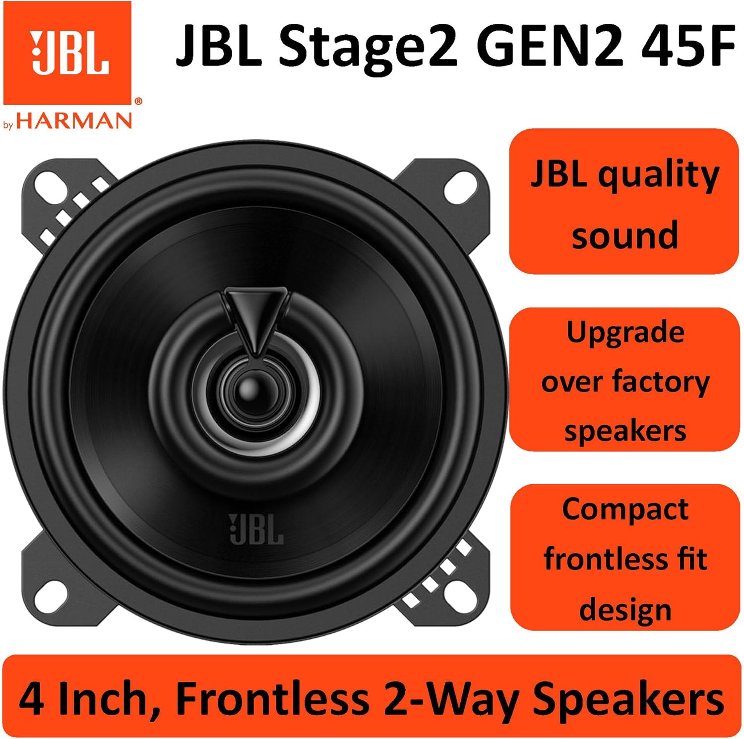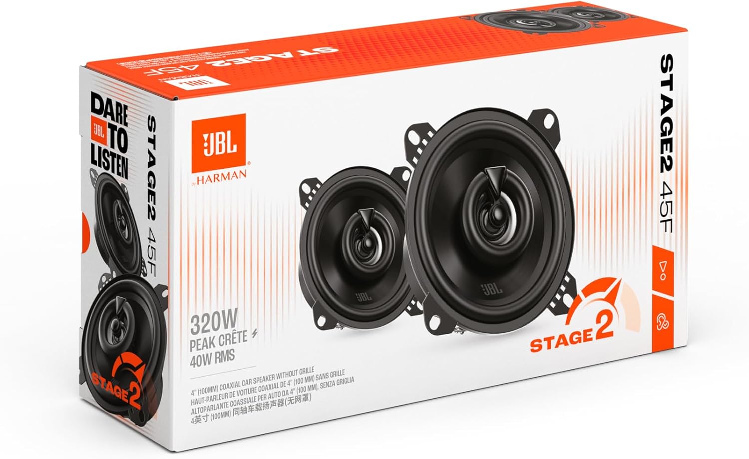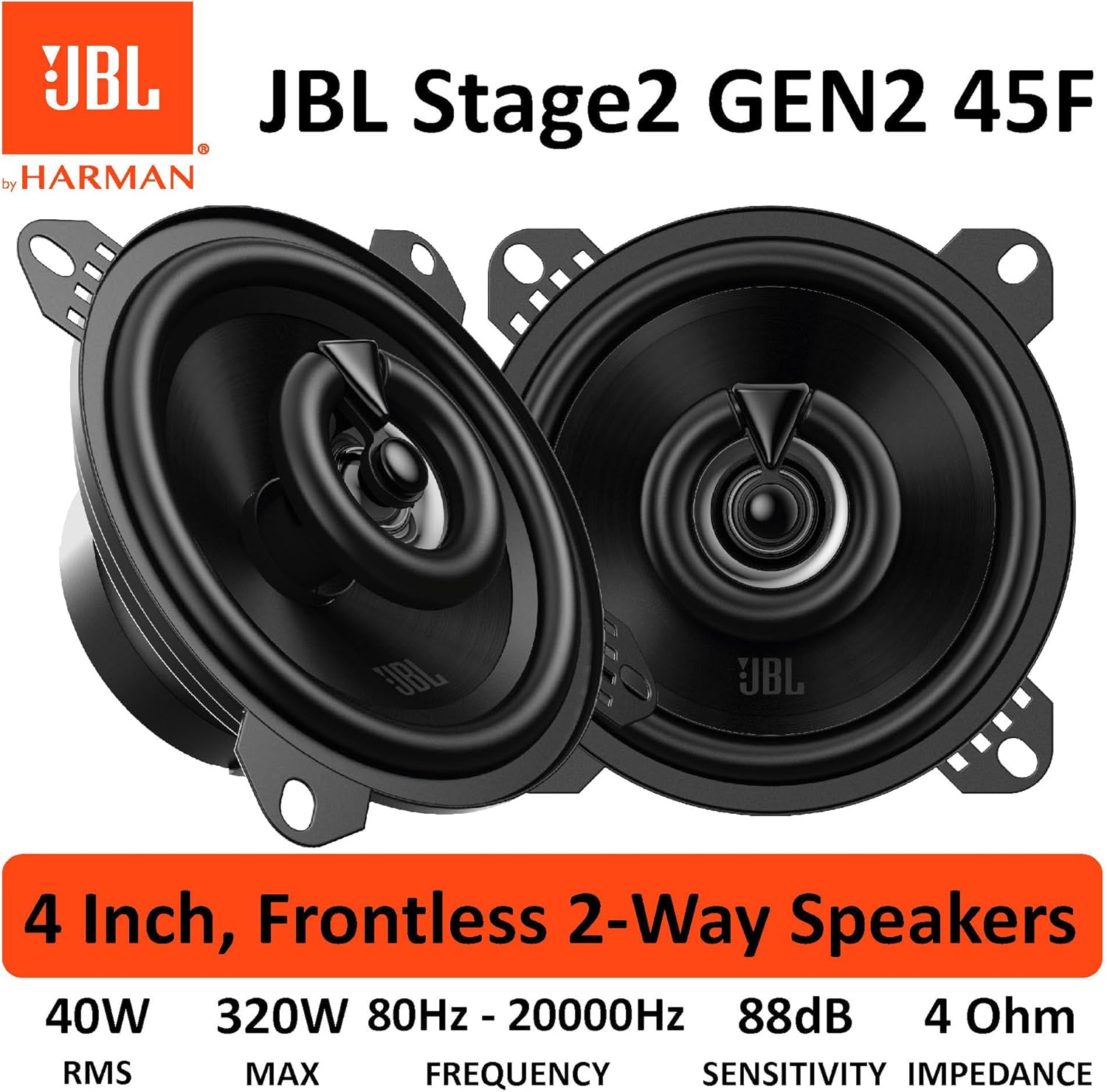 JBL Stage2 GEN2 45F коаксиални автомобилни високоговорители 100 мм (4 инча): от Harman Kardon Car HiFi с 40W RMS и 320W Max, комплект автомобилни високоговорители - чифт