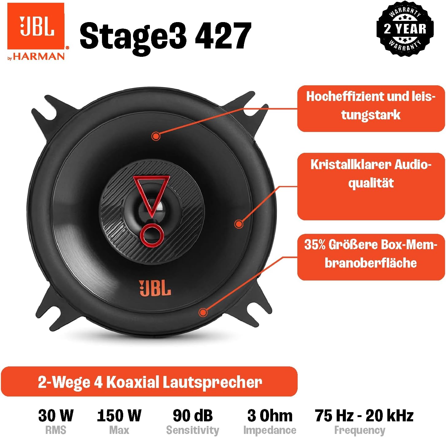 • Автомобилните високоговорители JBL Stage3 427 са високоефективни и мощни, осигурявайки страхотен звук и са идеално допълнение към всяка автомобилна Hi-Fi озвучителна система, дори и към фабрично инсталираните автомобилни стереоуредби с ниска мощност.