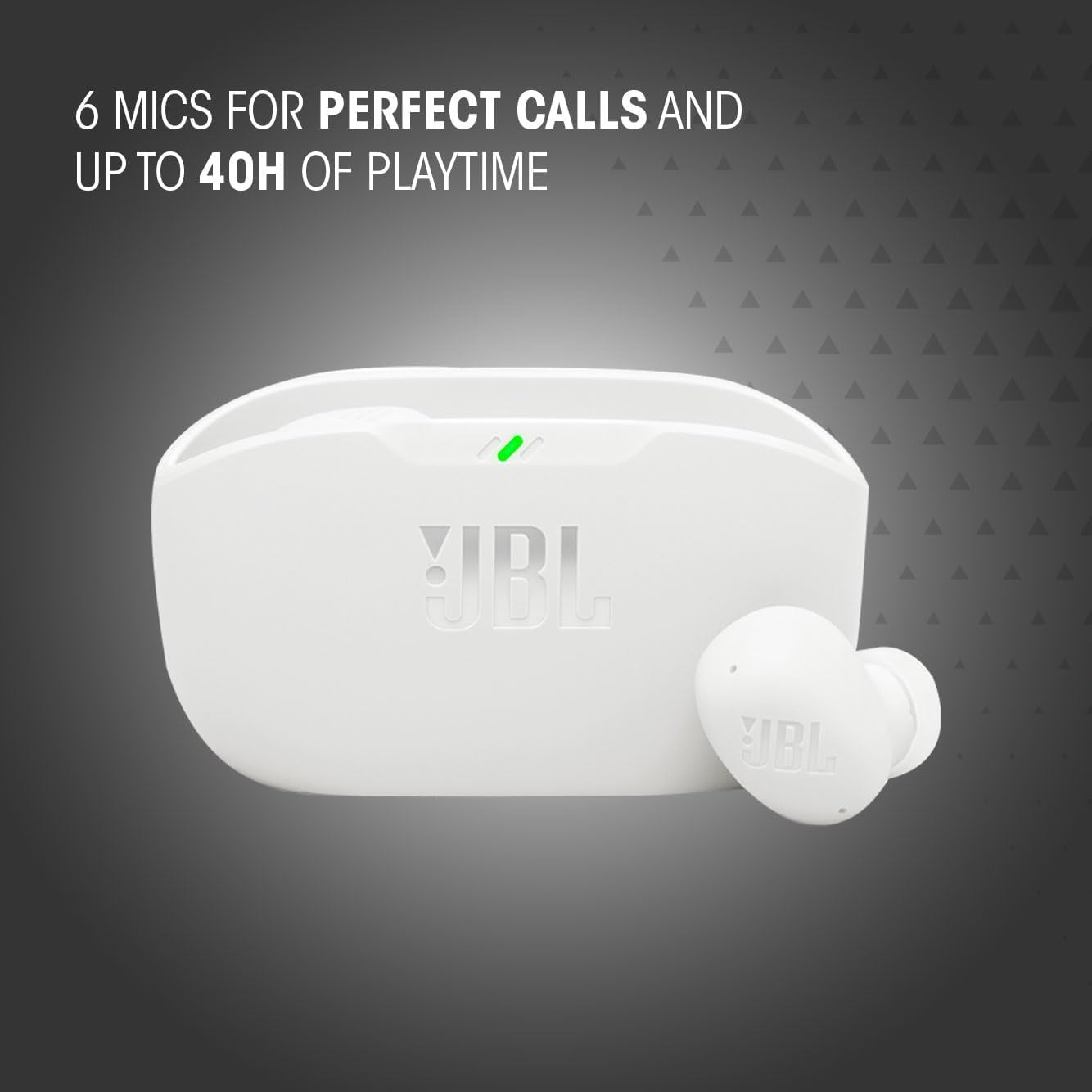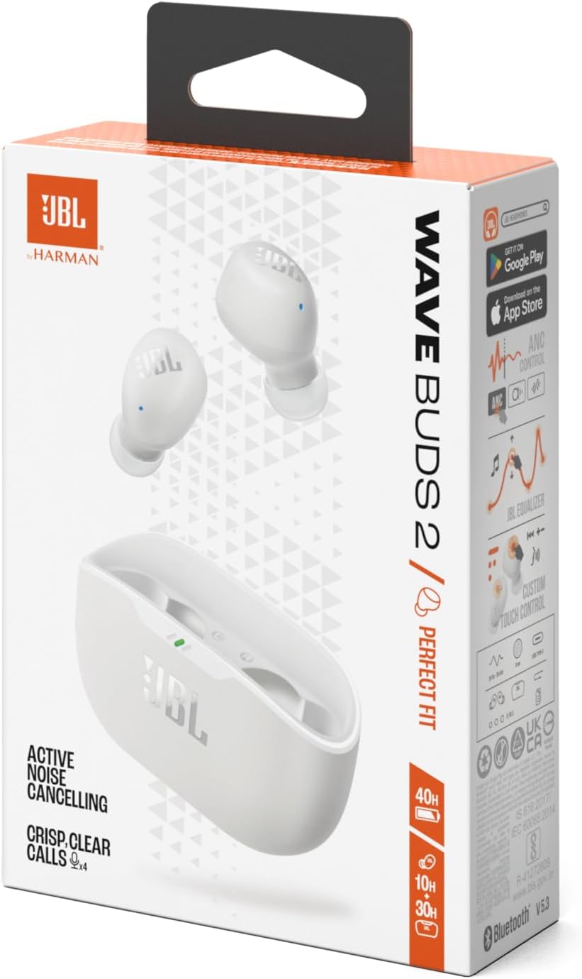 JBL Wave Buds 2 Безжични Bluetooth слушалки за уши с шумопотискане, 40 часа възпроизвеждане, JBL Pure Bass Sound, Smart Ambient технология, IP54 водо- и прахоустойчиви, многоточкова връзка, бели