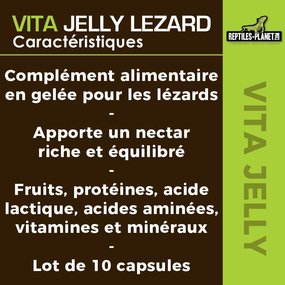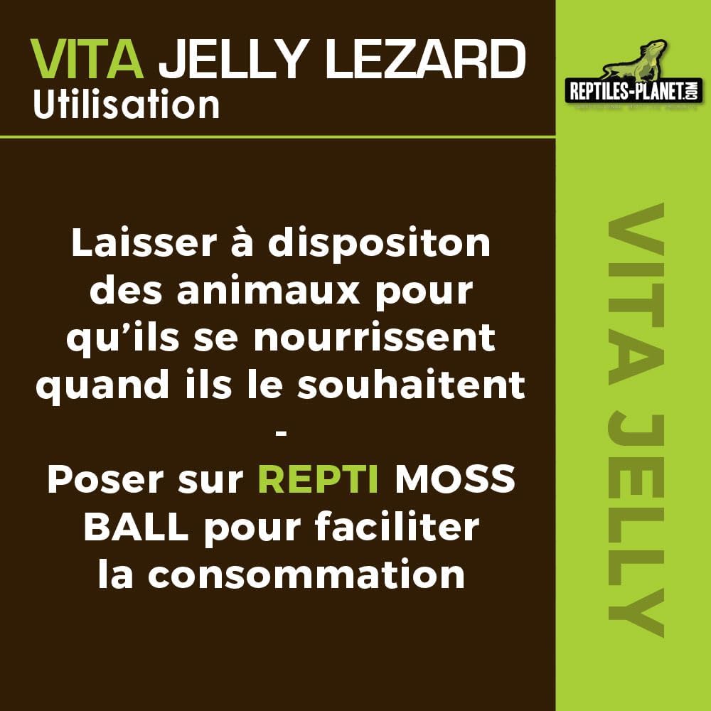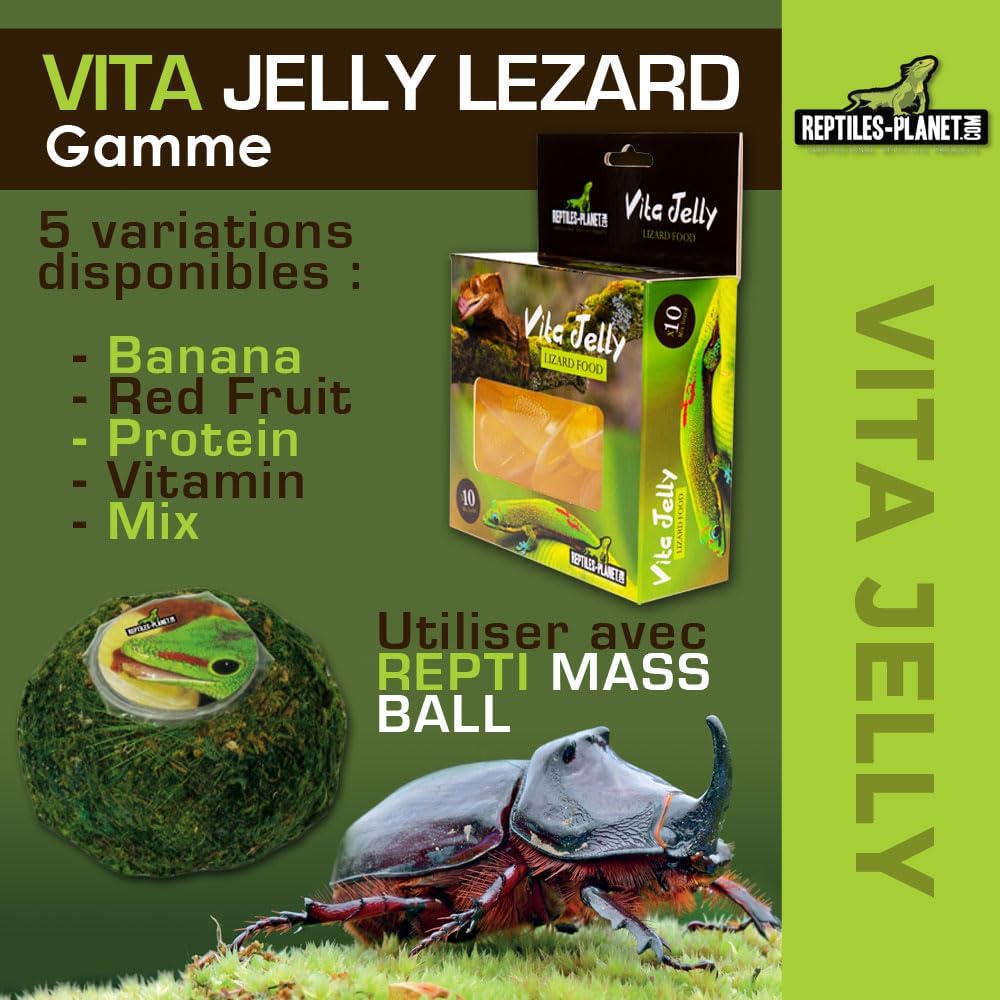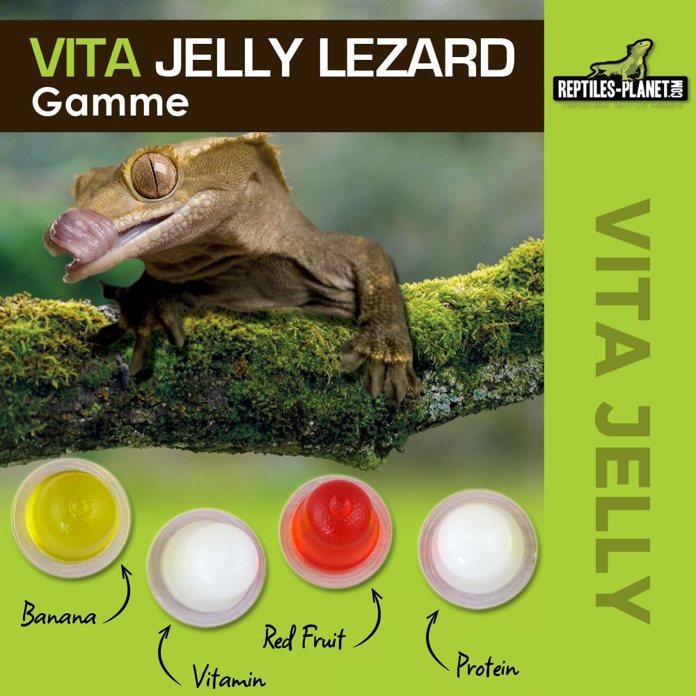 Vita Jelly е идеална хранителна добавка за повечето гущери, включително членове на семейство Iguanidae (игуани, аноли и др.) и семейство Phelsuma. Повечето гущери облизват плодове от дърветата или земята, когато са презрели. Vita Jelly им осигурява богат и балансиран нектар (плодове, протеини, млечна киселина, аминокиселини, витамини и минерали). Побира се в нашия държач "Beetle Stick".