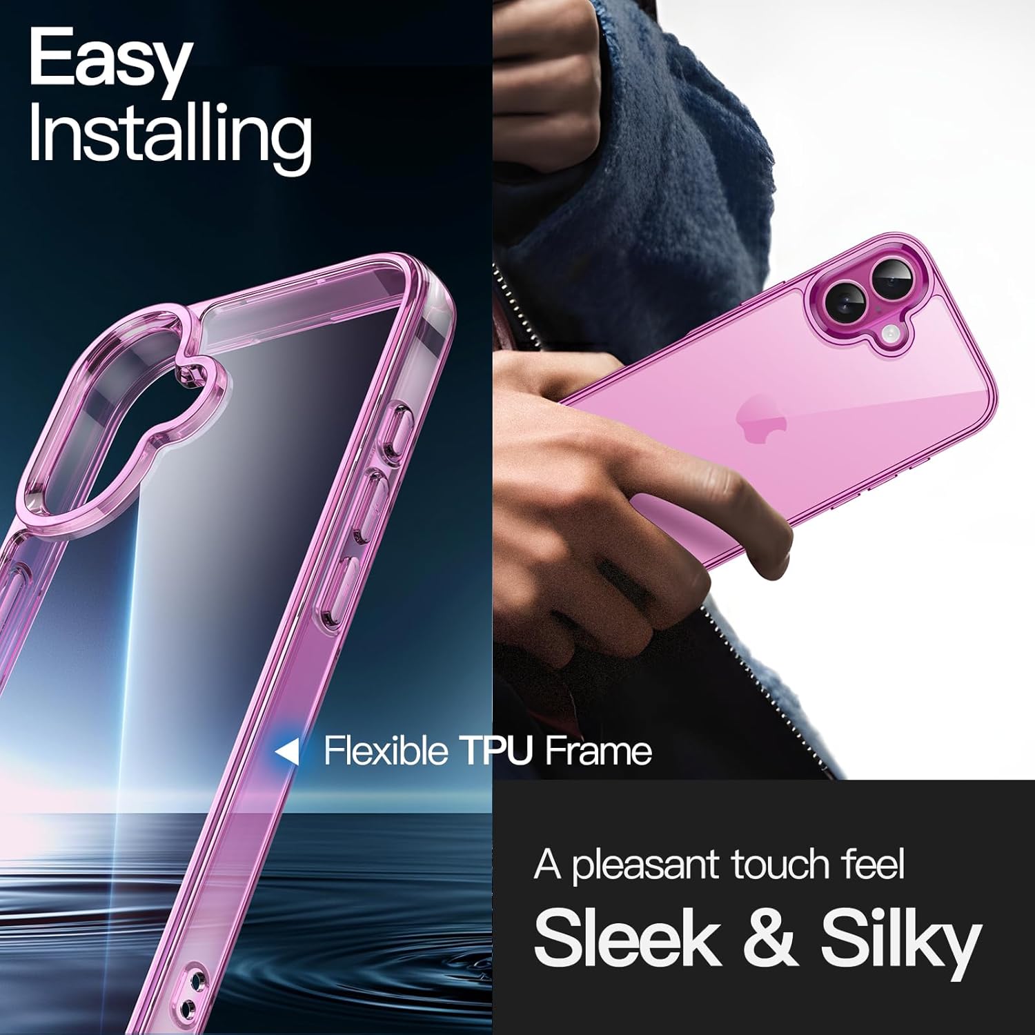 JETech калъф за iPhone 16 6.1 инча, непожълтяващ удароустойчив калъф тип „bumper“ за мобилен телефон, прозрачен гръб, устойчив на надраскване (розов)