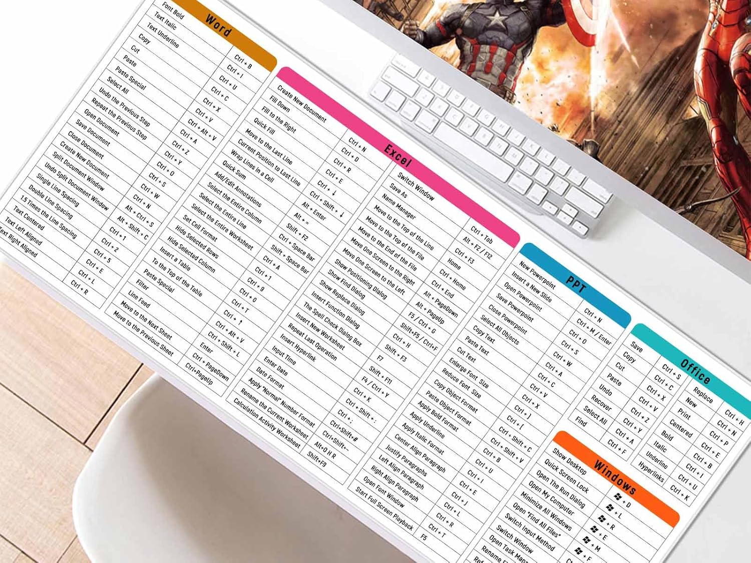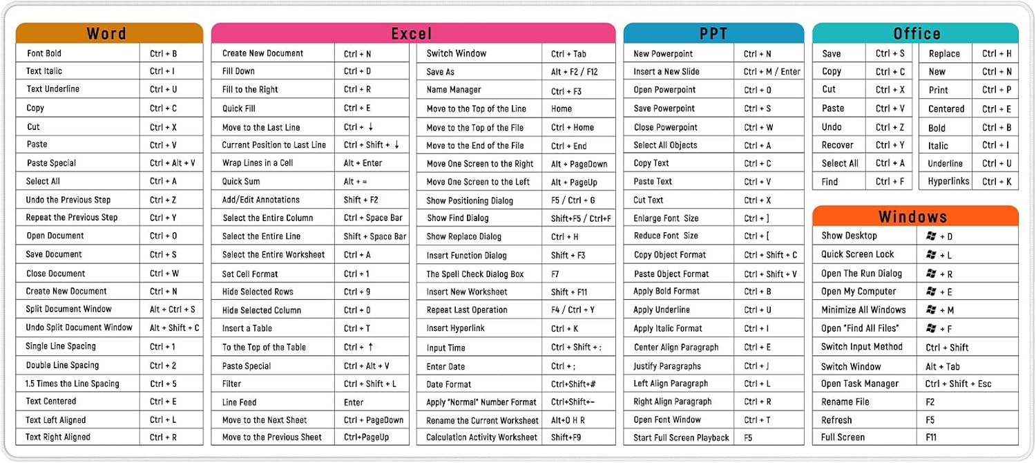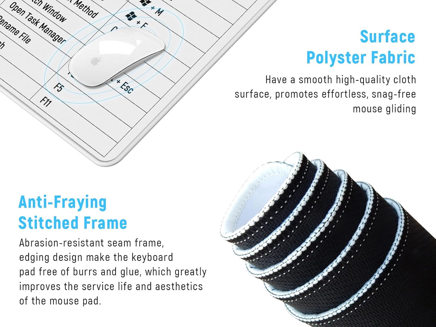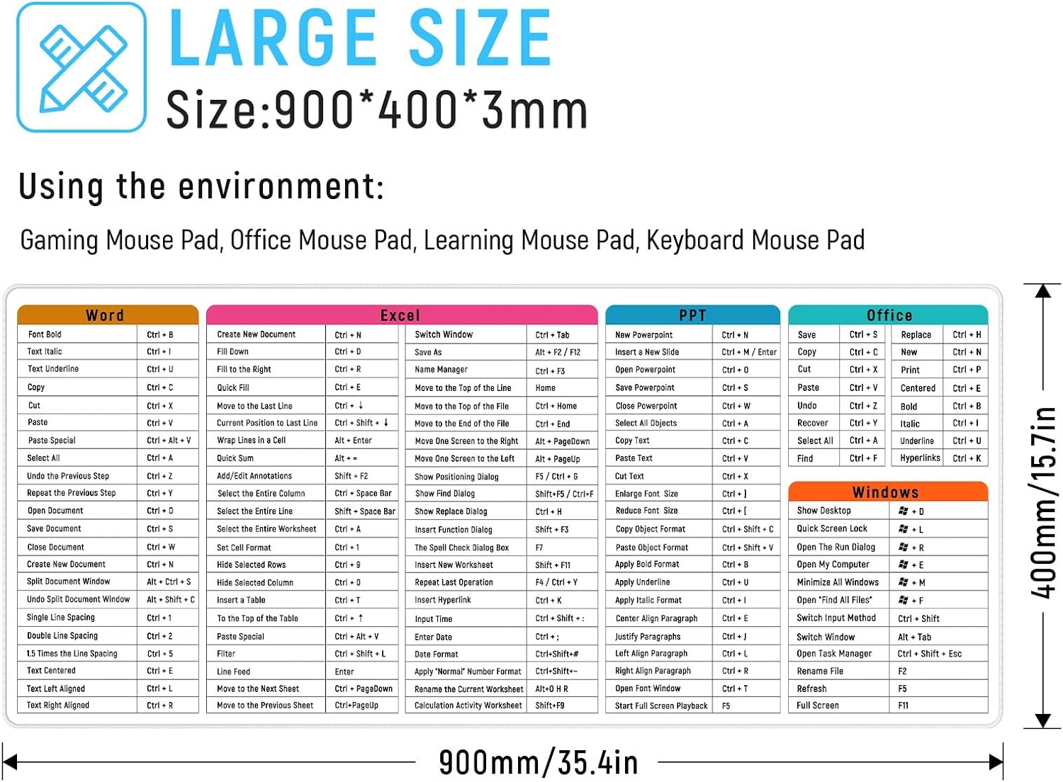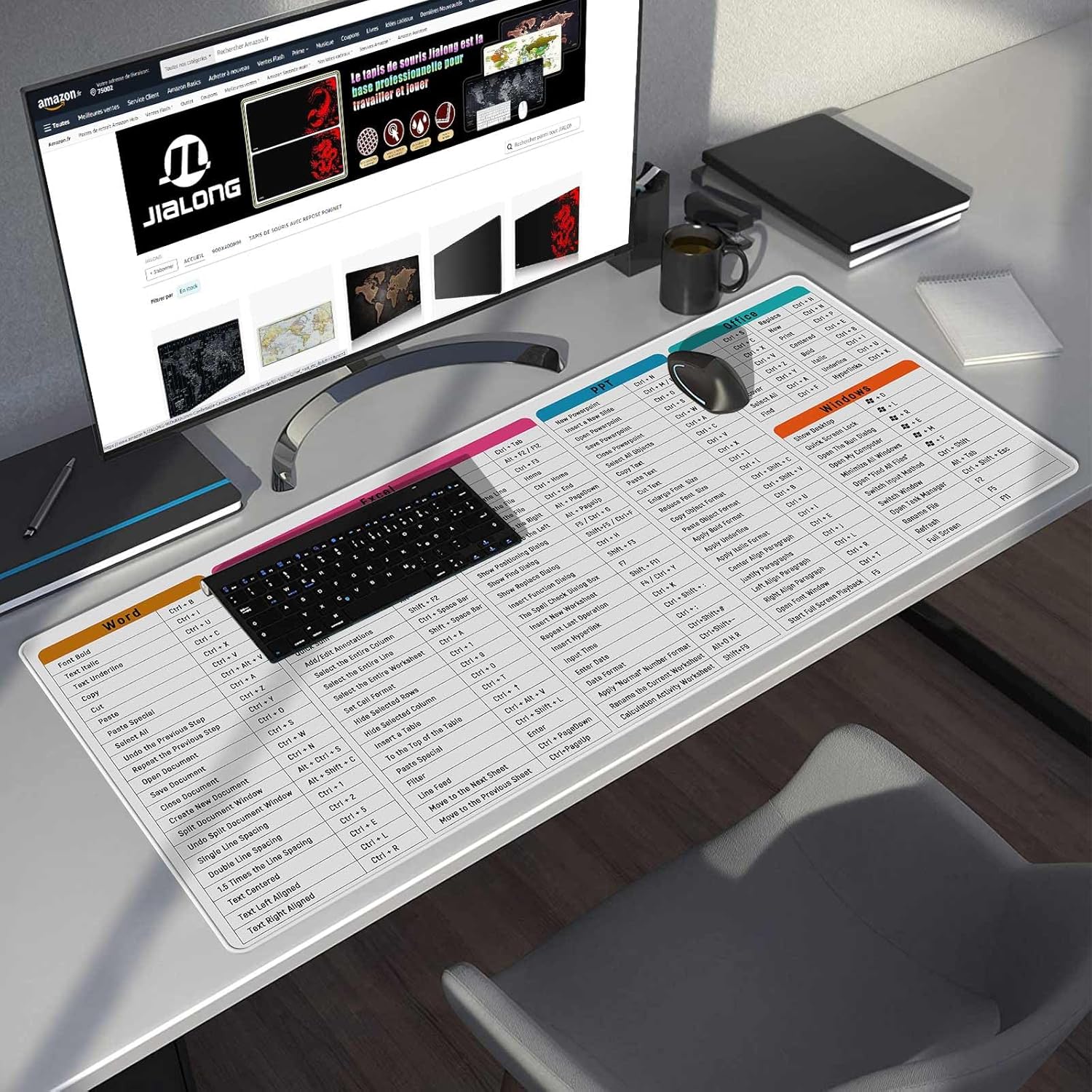 JIALONG XXL подложка за мишка с клавишни комбинации за Excel за офис, многофункционална, подложка за маса, подложка за мишка, неплъзгаща се подложка за бюро за компютър, MacBook, лаптоп, бяла, 900 x 400 мм