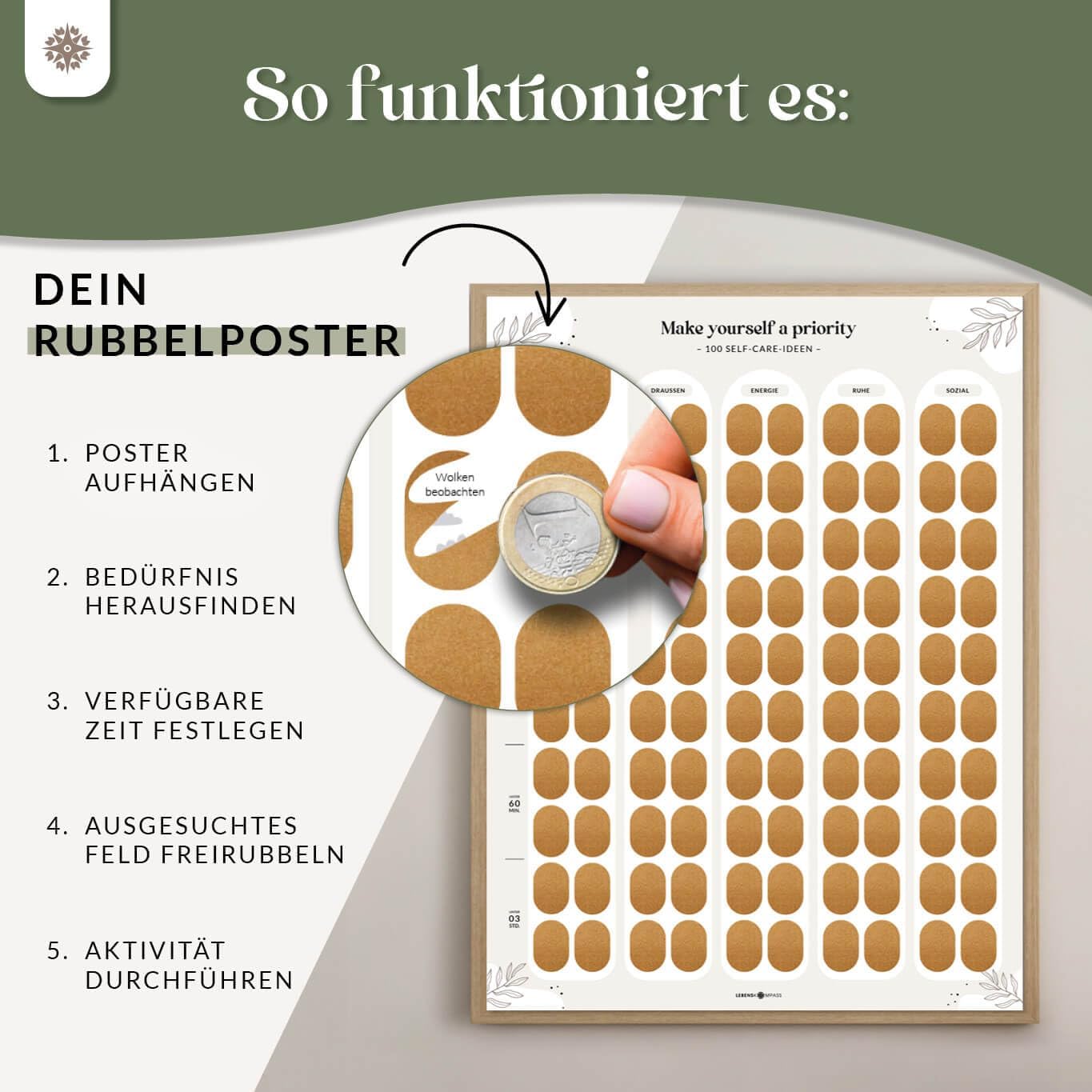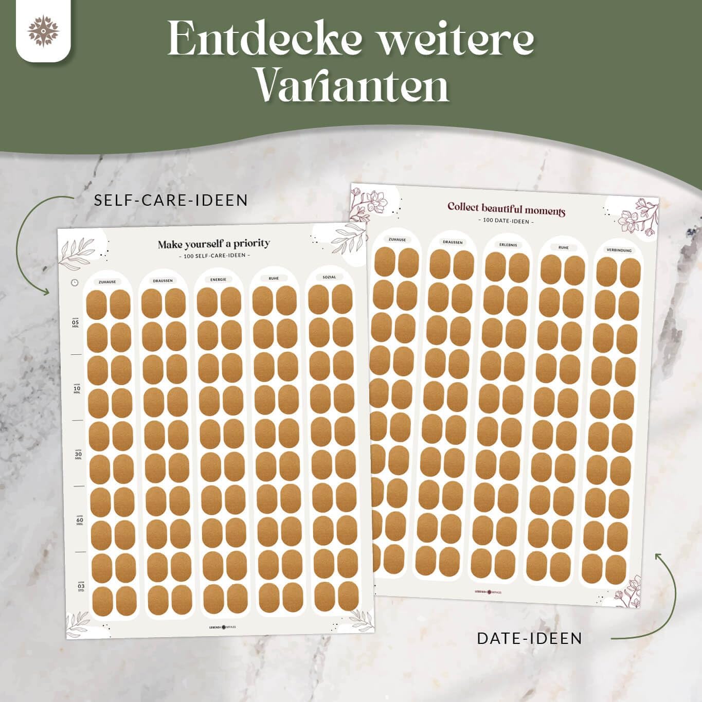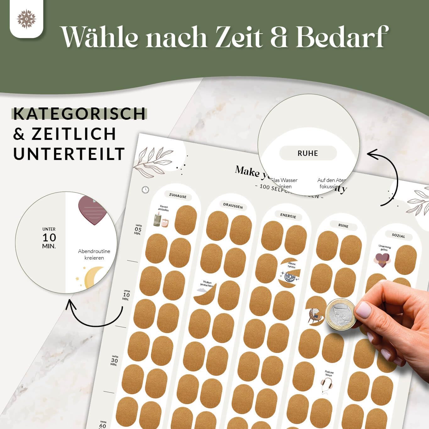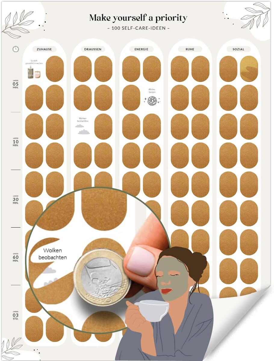 • Вашият спътник в грижата за себе си: този плакат със скреч карта предлага 100 идеи за грижа за себе си, които помагат за укрепване на осъзнатостта и любовта към себе си. Идеален за облекчаване на стреса и насърчаване на психичното здраве.