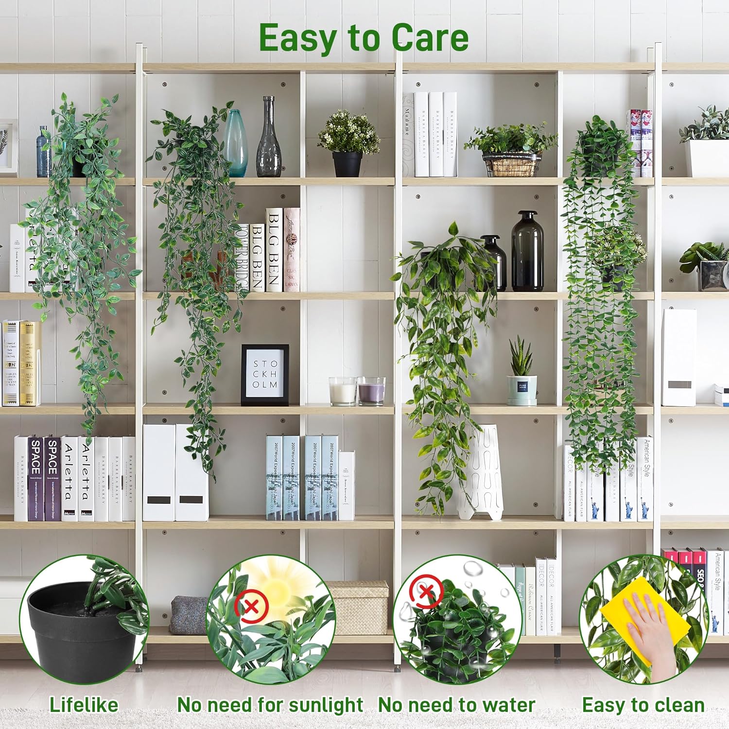 Тези зелени изкуствени висящи растения са много лесни за почистване. Просто изплакнете внимателно с чиста вода, за да възстановите свежия им вид.