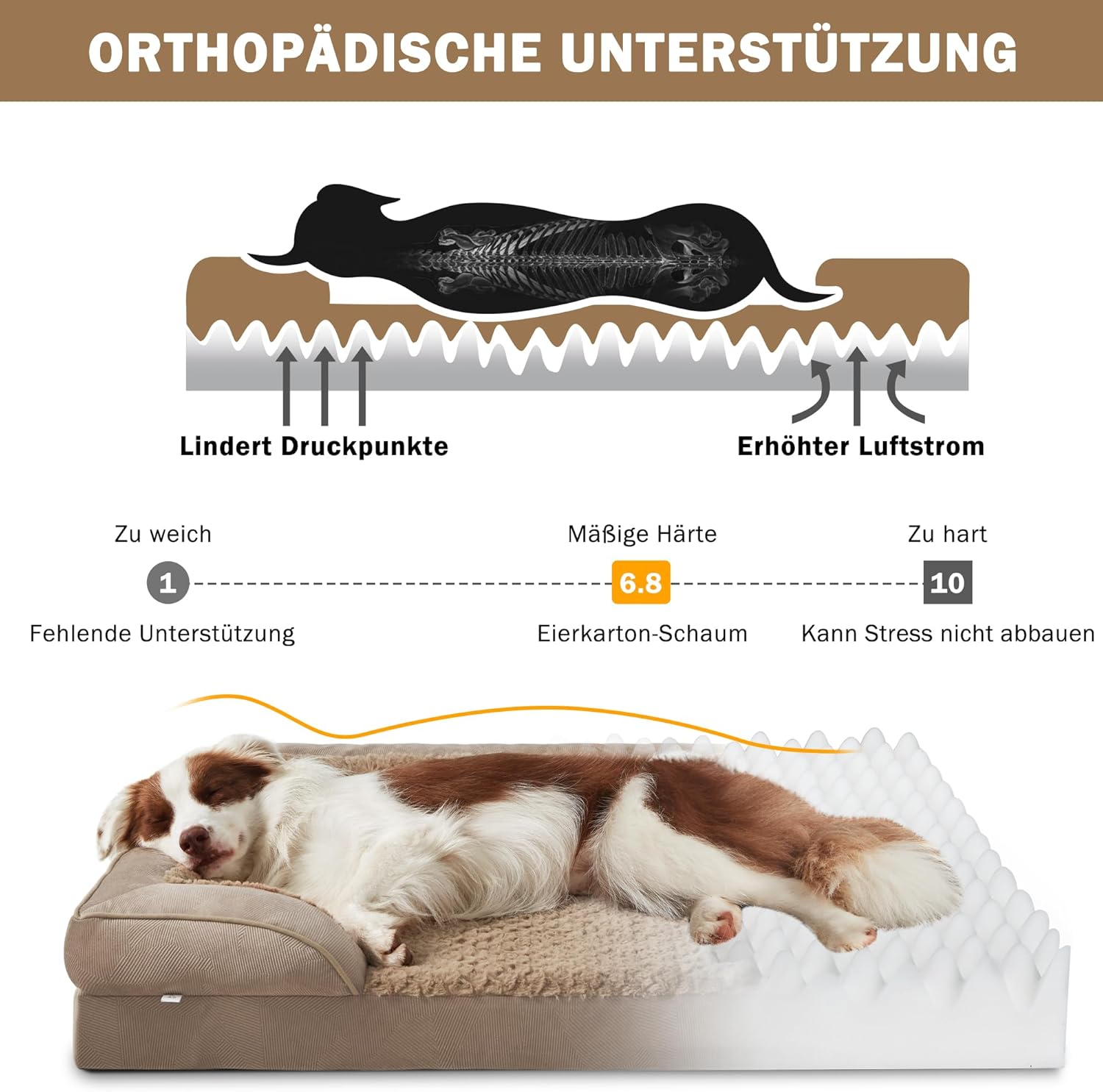 • Ортопедична опора: ортопедичното легло за кучета с пяна с висока плътност и структура тип „пчелна пита“ е истинска благословия за ставите и мускулите на вашите четириноги приятели. То облекчава точките на натиск и разпределя теглото равномерно за спокоен нощен сън. Пълнените с мъх подложки поддържат врата, гърба, бедрата и ставите, спомагат за облекчаване на дискомфорта и осигуряват дълбок и спокоен сън.
