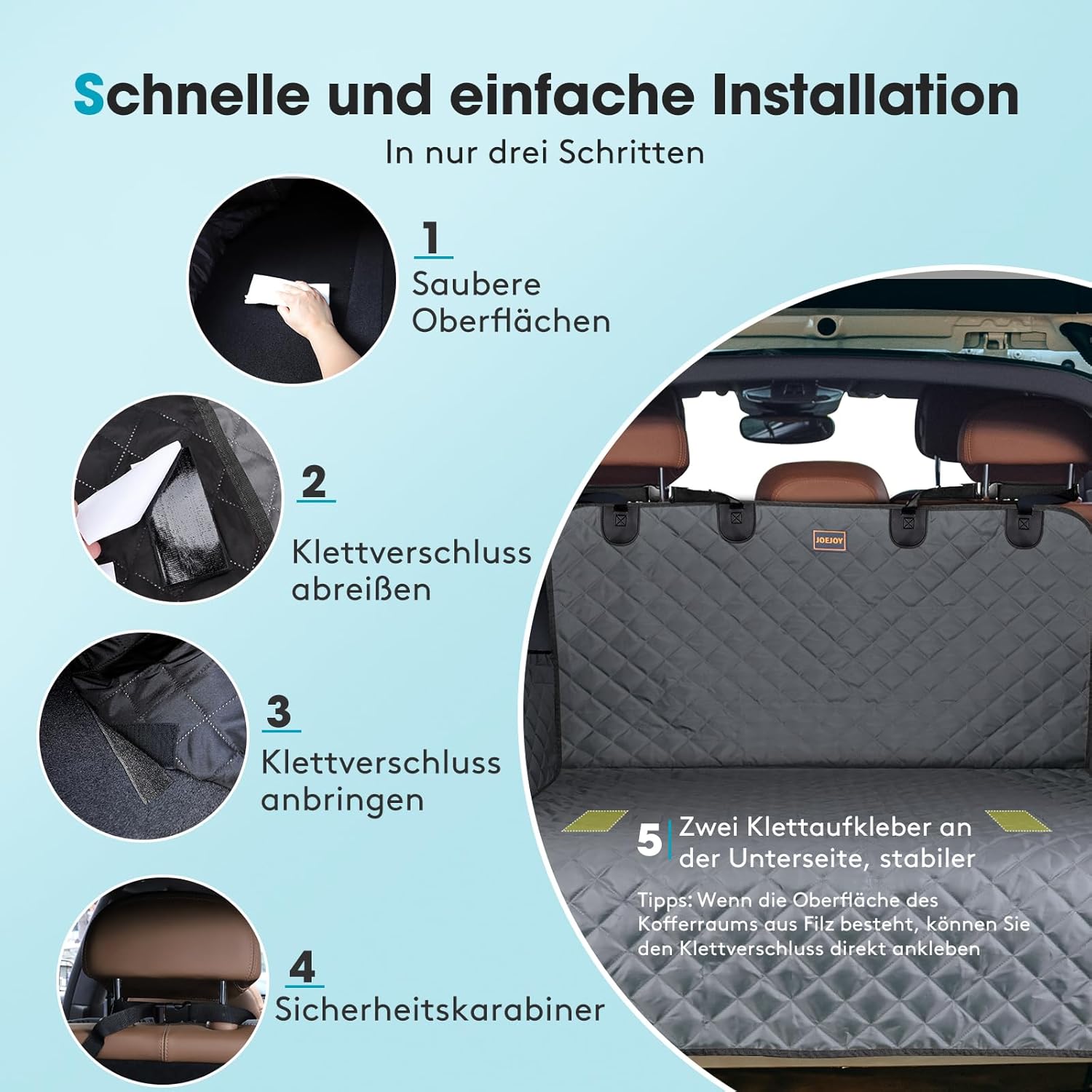 • Лесно сглобяване и почистване: заключете 2 регулируеми катарами на облегалките на колата и прикрепете 10-те страни на закопчалката към стената на колата. Инсталирайте за секунди. Одеялото за кола за кучета е много лесно за почистване. Просто избършете постелката за кучета с влажна кърпа и тя отново е искрящо чиста. Просто, ефективно и супер бързо. Висококачествените първокласни протектори за кучешки ботуши ви осигуряват чиста кола и страхотно пътуване с вашия пухкав приятел.