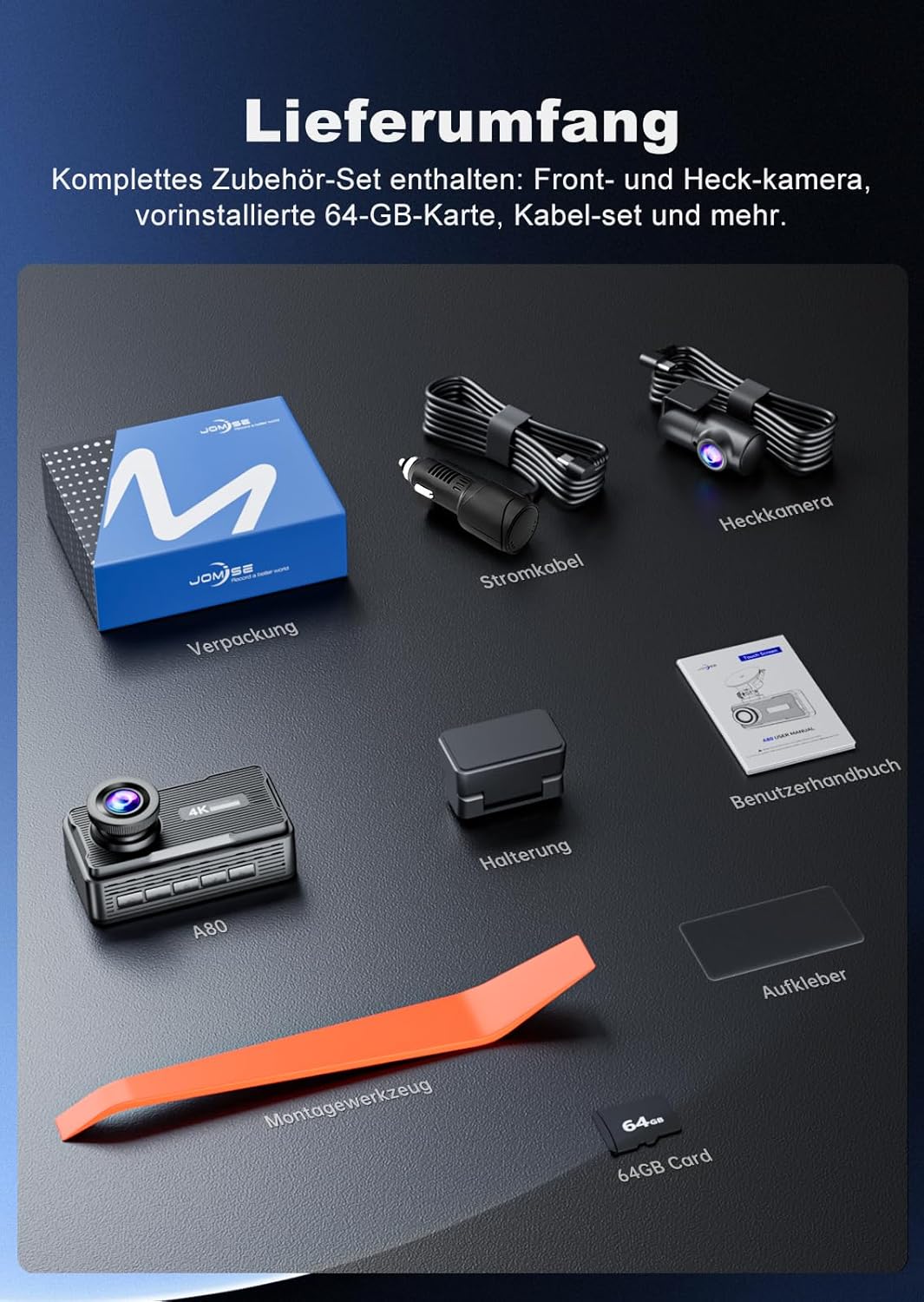 JOMISE 4K+4K видеорегистратор за автомобили отпред и отзад, ултрабърз Ethernet пренос на данни (20 Mbps) и стабилен WiFi 6, сензорен екран за кола с GPS, нощно виждане, 24-часово наблюдение на паркирането, място за съхранение до 1TB (A80 Pro)