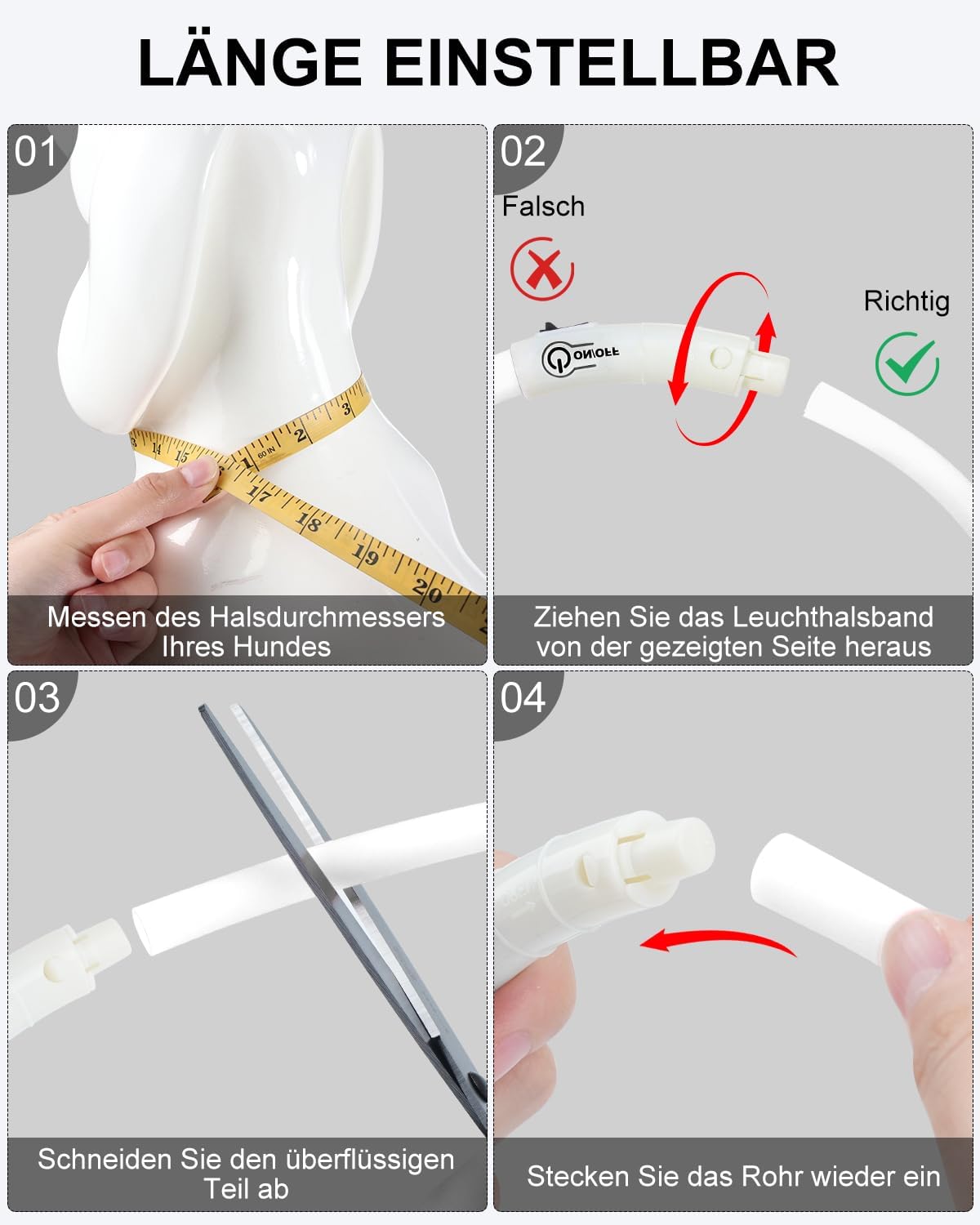 • РАЗМЕР ЗА РЯЗАНЕ: Дължината на светещия нашийник за кучета е 70 см (27,5 инча). Всичко, от което се нуждаете, е ножица, за да го скъсите до желаната дължина. Нашийникът се характеризира със своята здравина и лекота и е подходящ за всеки домашен любимец.
