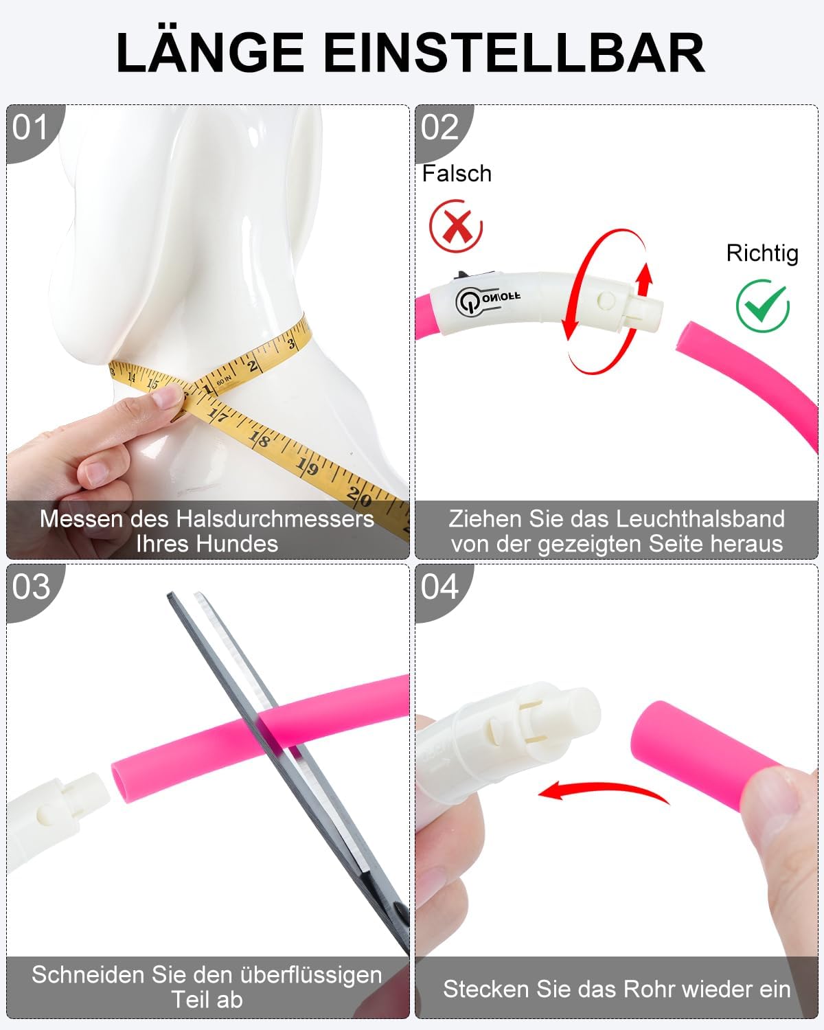 • РАЗМЕР ЗА РЯЗАНЕ: Дължината на светещия нашийник за кучета е 70 см (27,5 инча). Всичко, от което се нуждаете, е ножица, за да го скъсите до желаната дължина. Нашийникът се характеризира със своята здравина и лекота и е подходящ за всеки домашен любимец.