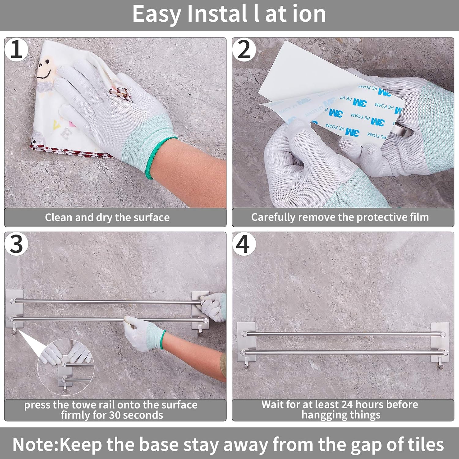 • Бележки: Този самозалепващ се държач за кърпи не е подходящ за тапети или боядисани стени. За да сте сигурни, че е здраво закрепен на мястото си, изчакайте 48 часа, преди да окачите нещата.