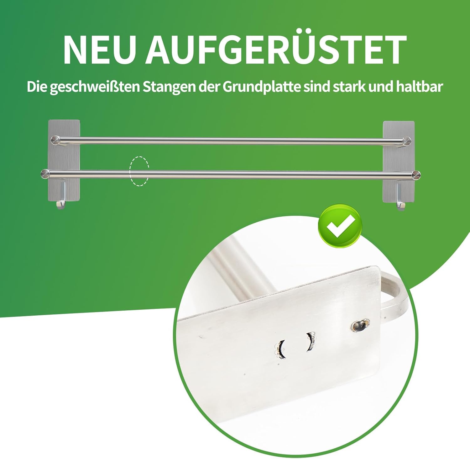 JS Поставка за кърпи за баня, без пробиване, държач за кърпи за чай от неръждаема стомана, самозалепващ се, двоен държач за кърпи за баня с 2 кукички за кърпи, за стенен монтаж, баня, кухня