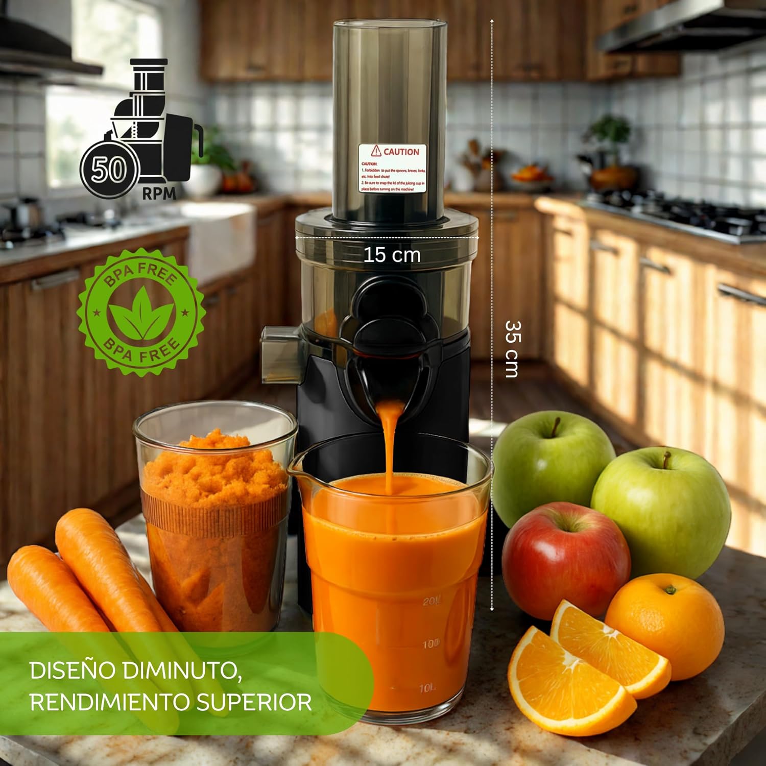 • Компактен и елегантен дизайн Нашата компактна сокоизстисквачка се вписва идеално във всяка кухня, спестявайки място без компромис с производителността. Модерният и елегантен дизайн допълва всеки декор.