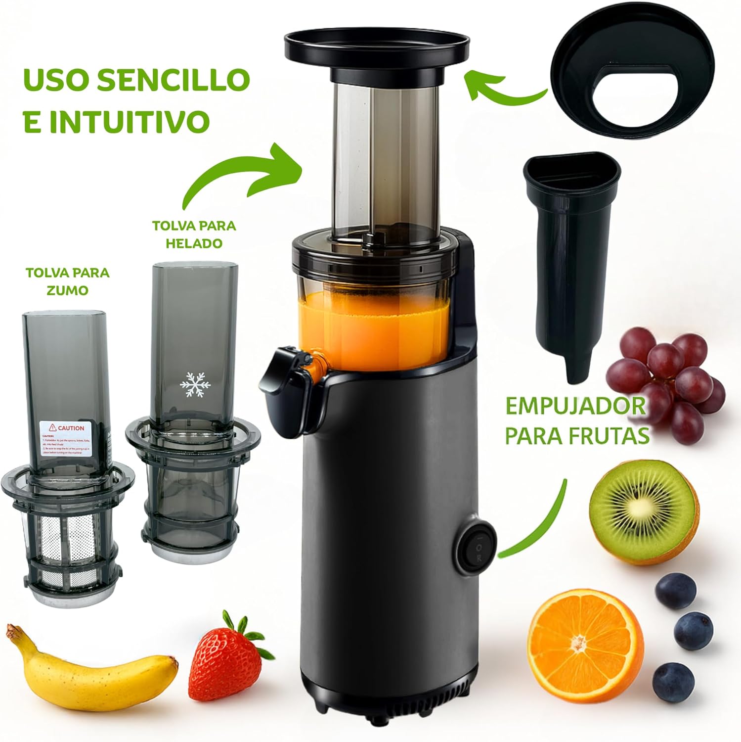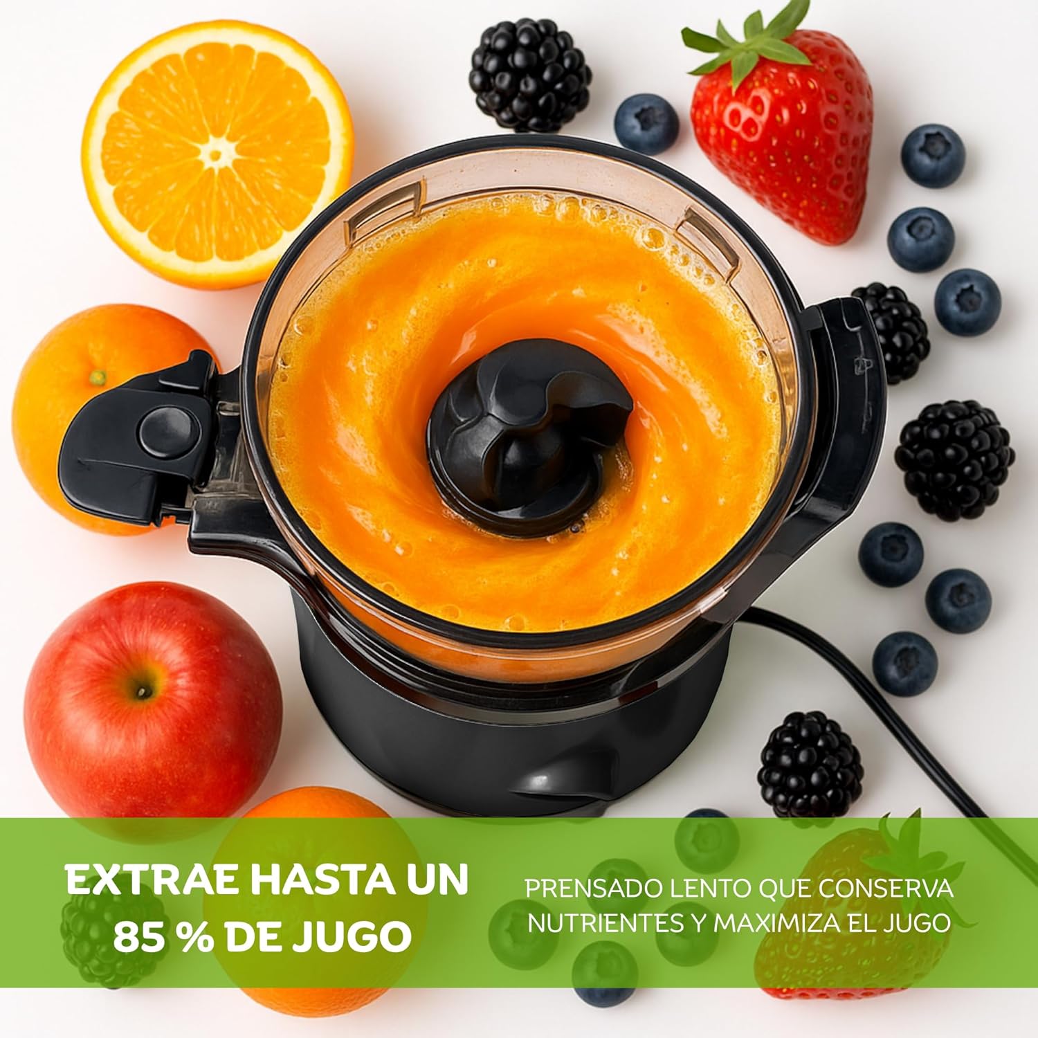 • УНИВЕРСАЛНОСТ В РЪЦЕТЕ ВИ Нашата компактна сокоизстисквачка с бавно действие е способна да извлича сок от различни плодове и зеленчуци, включително зелени листа и твърди плодове. Насладете се на пресни и здравословни сокове от любимите си съставки.