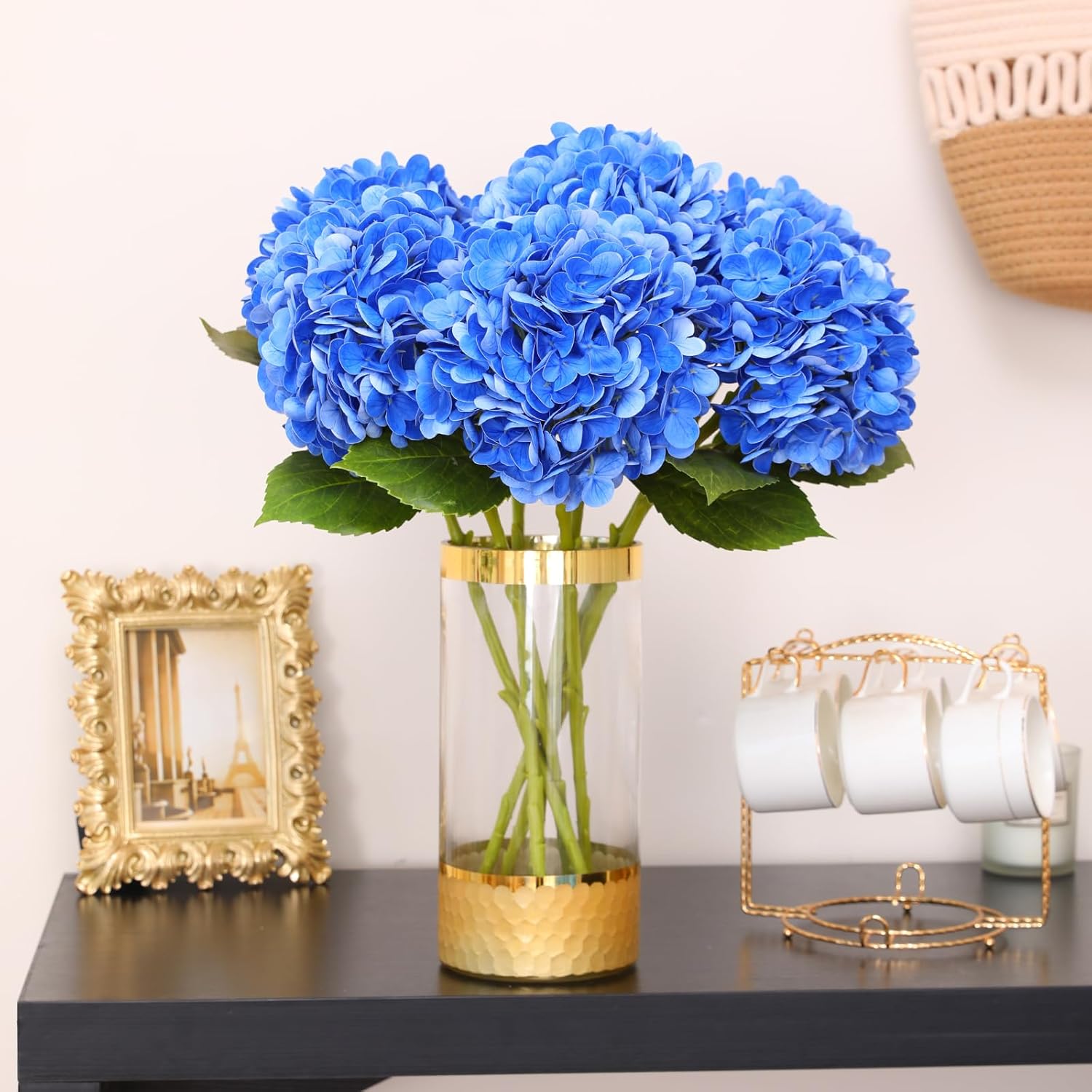 JUSTOYOU Комплект от 3 изкуствени цветя от хортензия, единични дълги стъбла, реалистични цветя от хортензия, големи 19,6 инча, истински букети от изкуствени хортензии за сватбено домашно парти (тъмносиньо)