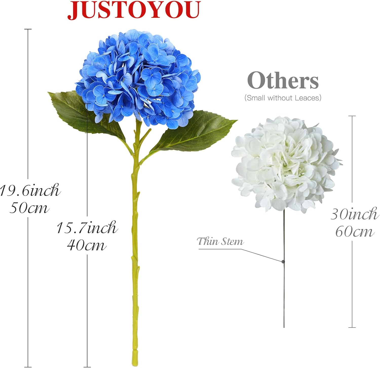• Размер Нашата изкуствена хортензия има дължина на един цвят приблизително 50 см и диаметър на главата приблизително 20 см. С висококачествени цветни стъбла, степента на извивка може да се регулира. Цялата единична хортензия изглежда много реалистично, с ярки цветове.