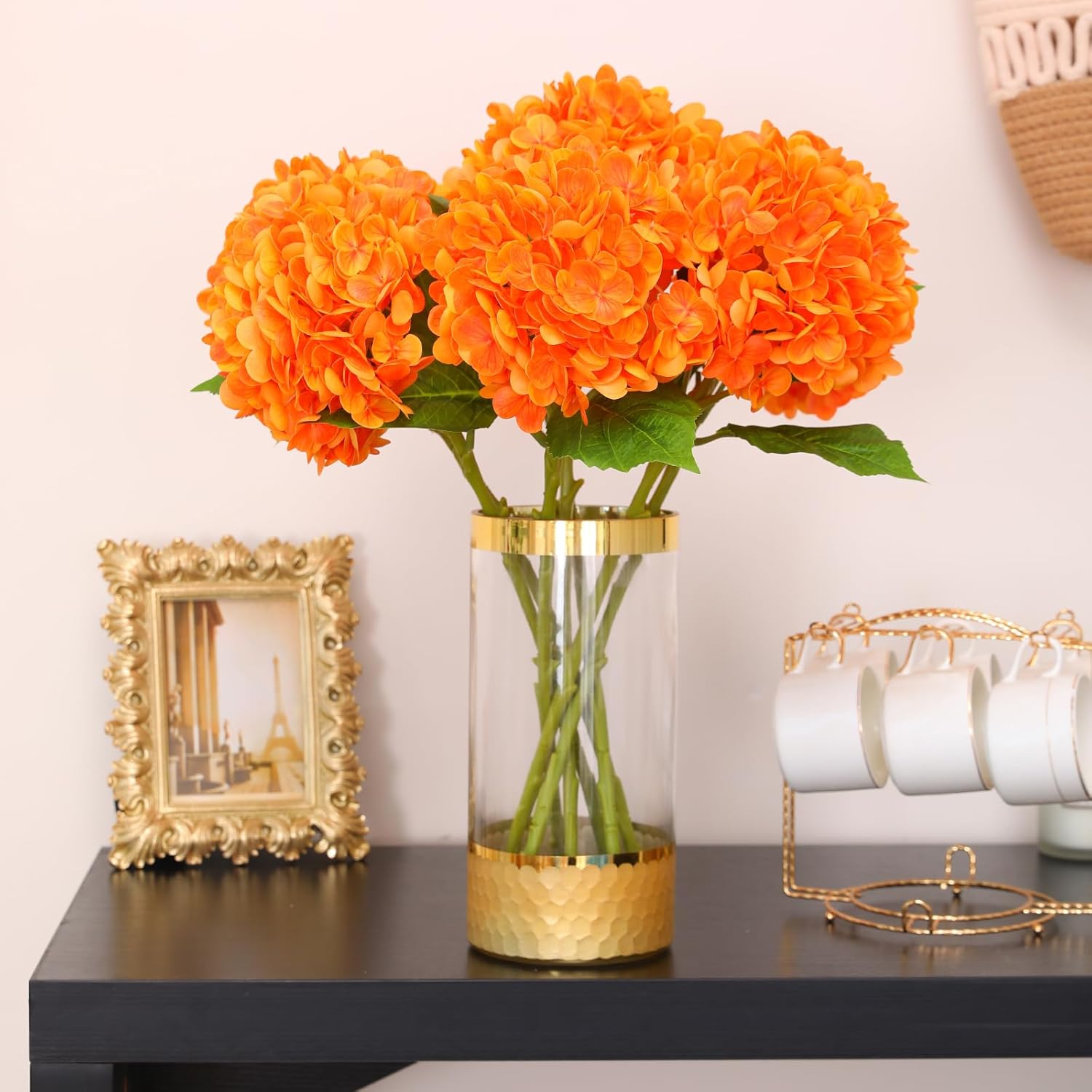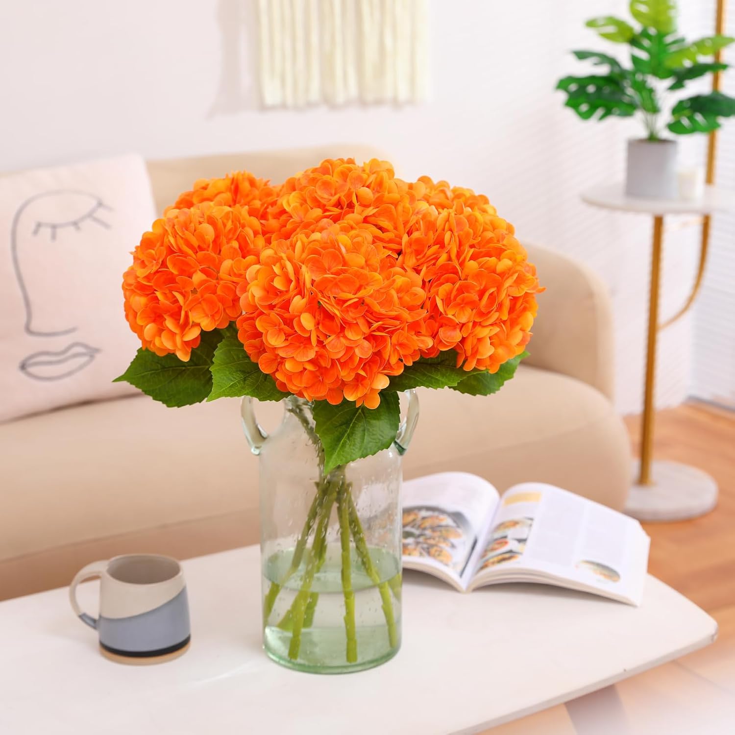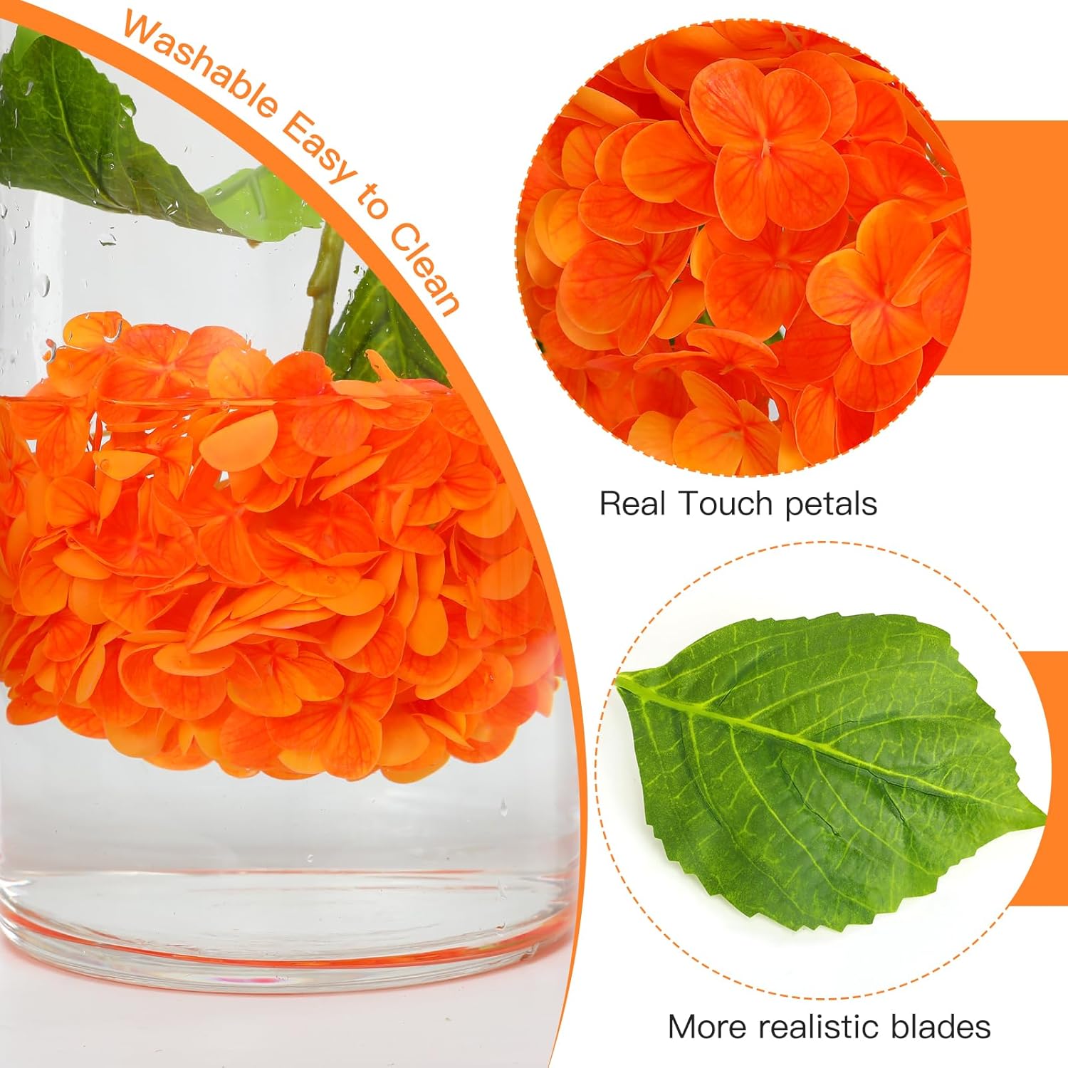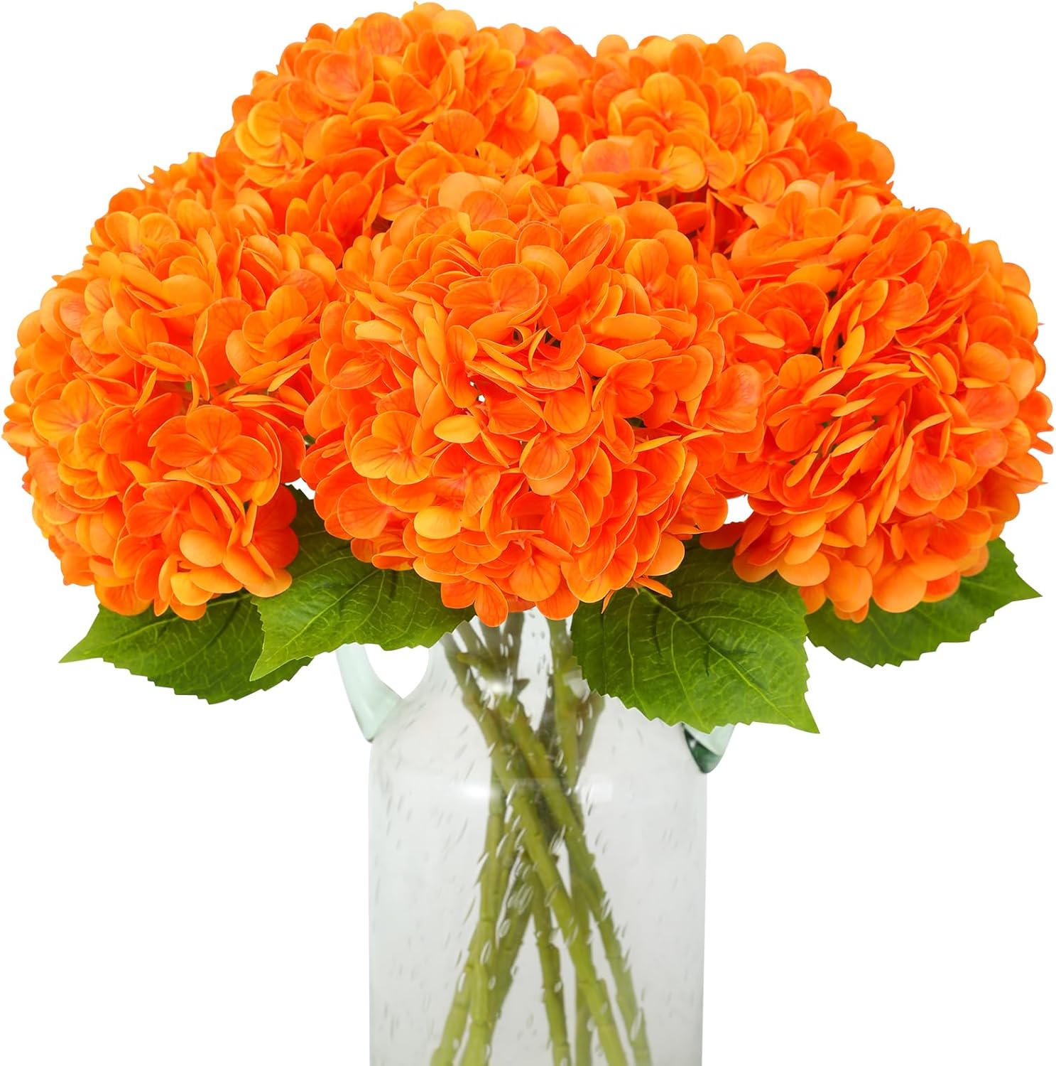 JUSTOYOU Комплект от 3 изкуствени цветя от хортензия, единични дълги стъбла, реалистични цветя от хортензия, големи 19,6 инча с истински тъч, букети от изкуствени хортензии за сватба, домашно парти (оранжеви)