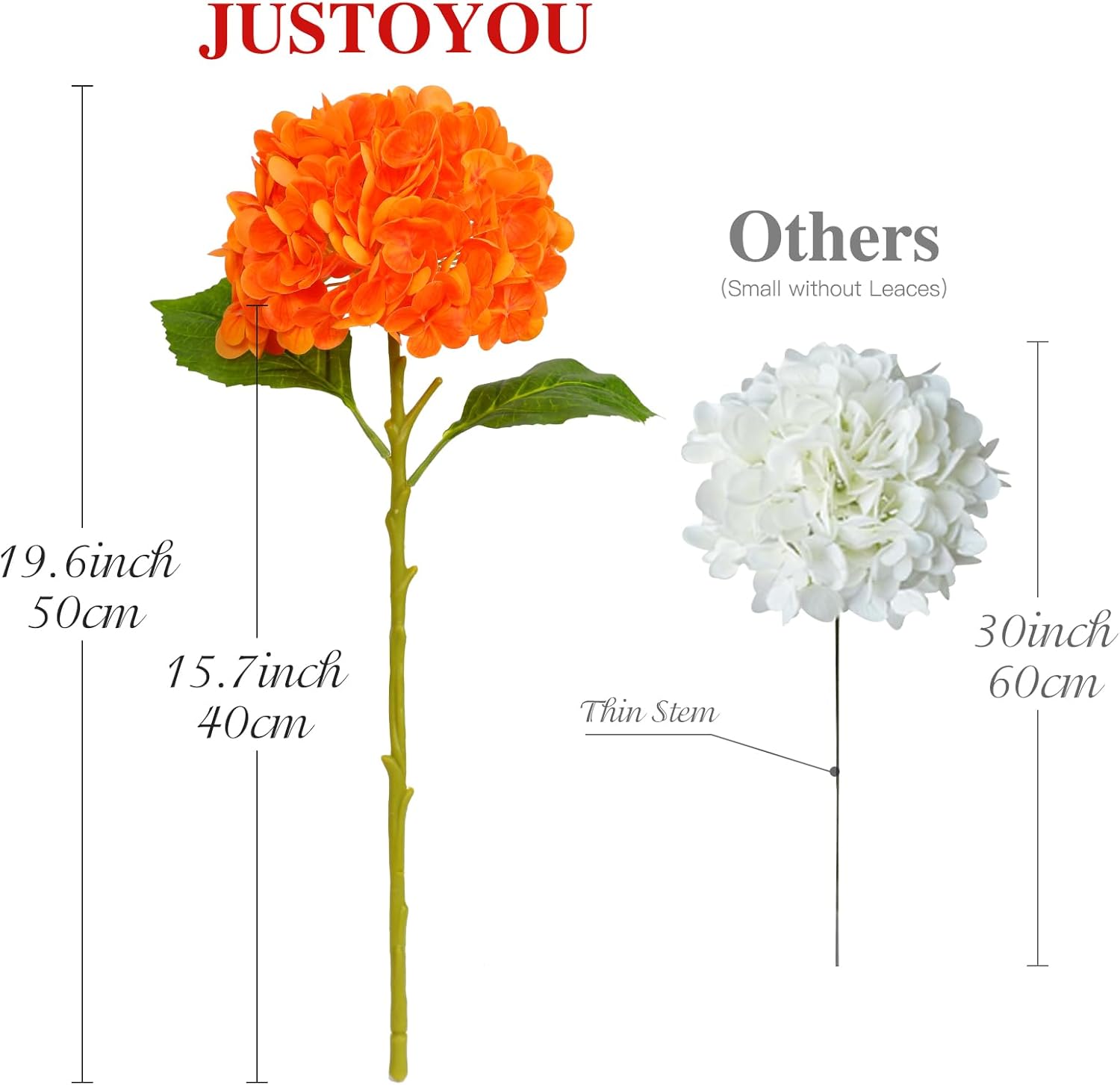 • Размер Нашата изкуствена хортензия има дължина на един цвят приблизително 50 см и диаметър на главата приблизително 20 см. С висококачествени цветни стъбла, степента на извивка може да се регулира. Цялата единична хортензия изглежда много реалистично, с ярки цветове.
