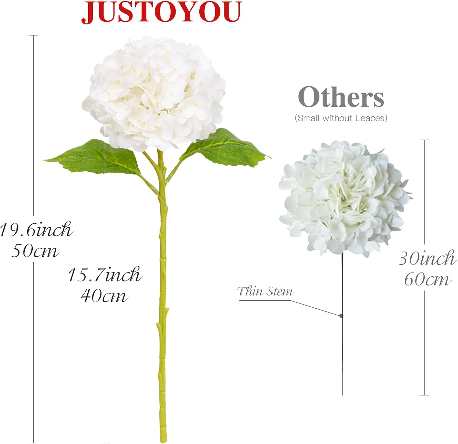 • Размер Нашата изкуствена хортензия има дължина на един цвят приблизително 50 см и диаметър на главата приблизително 20 см. С висококачествени цветни стъбла, степента на извивка може да се регулира. Цялата единична хортензия изглежда много реалистично, с ярки цветове.
