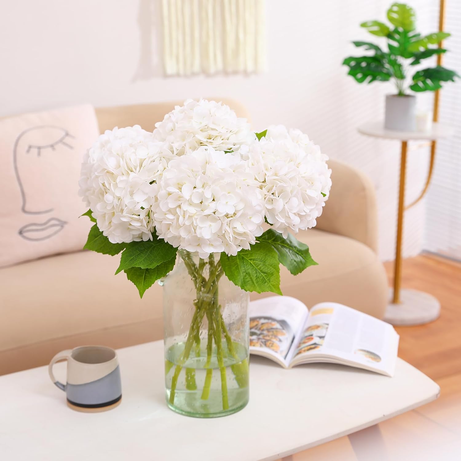 JUSTOYOU Комплект от 3 изкуствени цветя от хортензия, единични дълги стъбла, реалистични цветя от хортензия, големи букети от изкуствени хортензии с истински ефект, 19,6 инча, за сватбено домашно парти (бели)