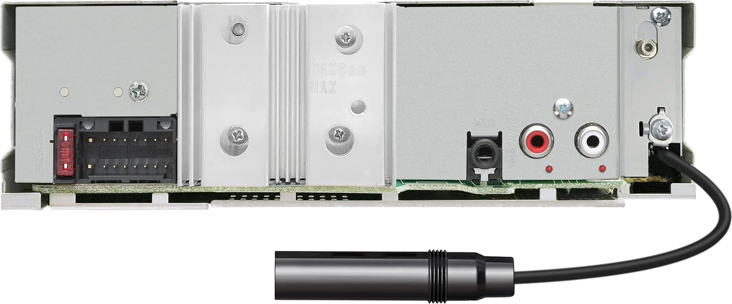 • Преден AUX-IN (3,5 мм жак) и USB вход със защитен капак; превключващ се RCA предусилвател с 2,5 V за задни слушалки/субуфер; директно свързване на субуфера; връзка за дистанционно управление от волана, специфично за автомобила, чрез опционален адаптер; заден вход за микрофон за свободни ръце (включен в комплекта)
