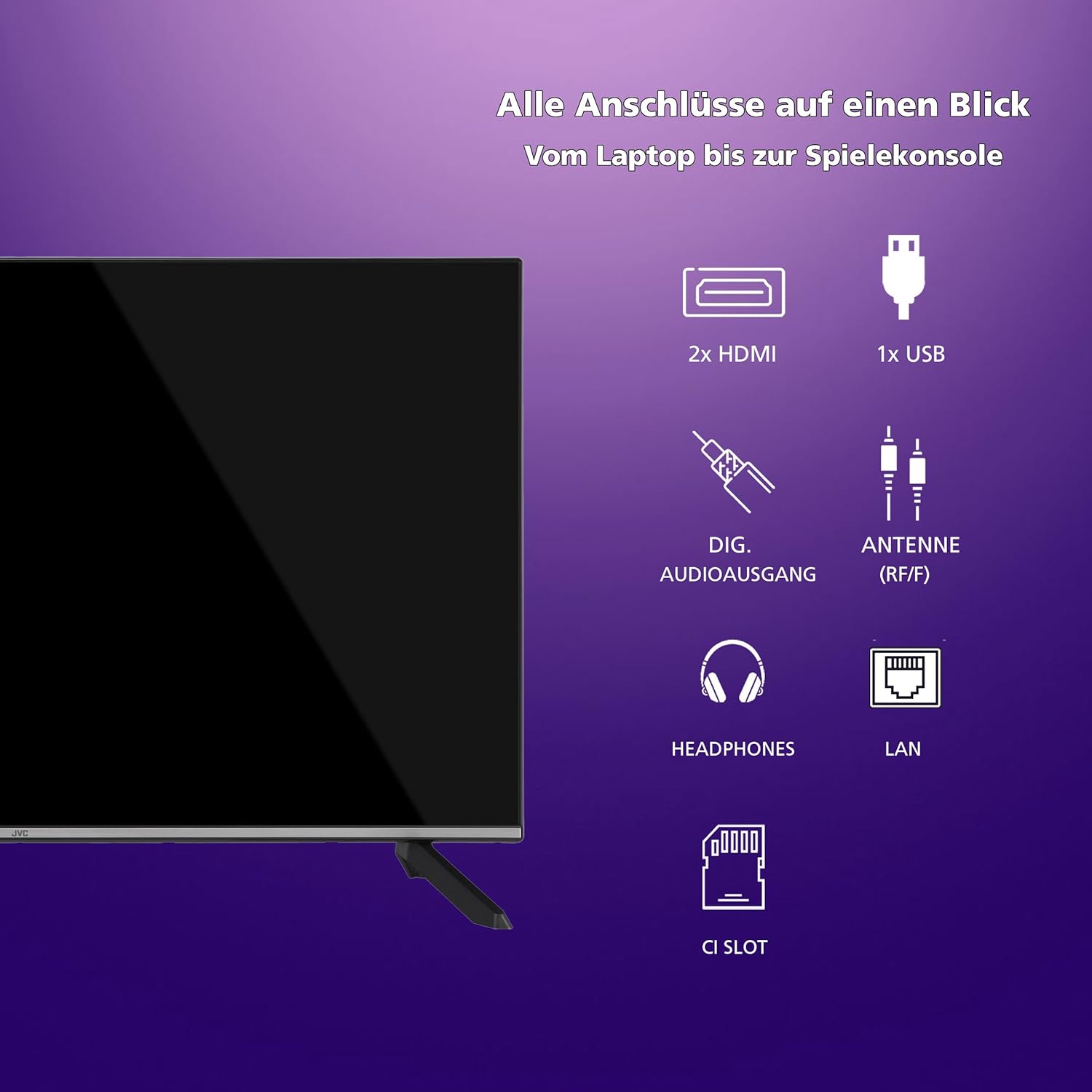 Телевизорът JVC може лесно да се свърже с интернет или други устройства чрез LAN порт или вграден WLAN/WiFi. Възползвайте се от възможностите на световната мрежа за сърфиране, пазаруване, игри или социални медии.