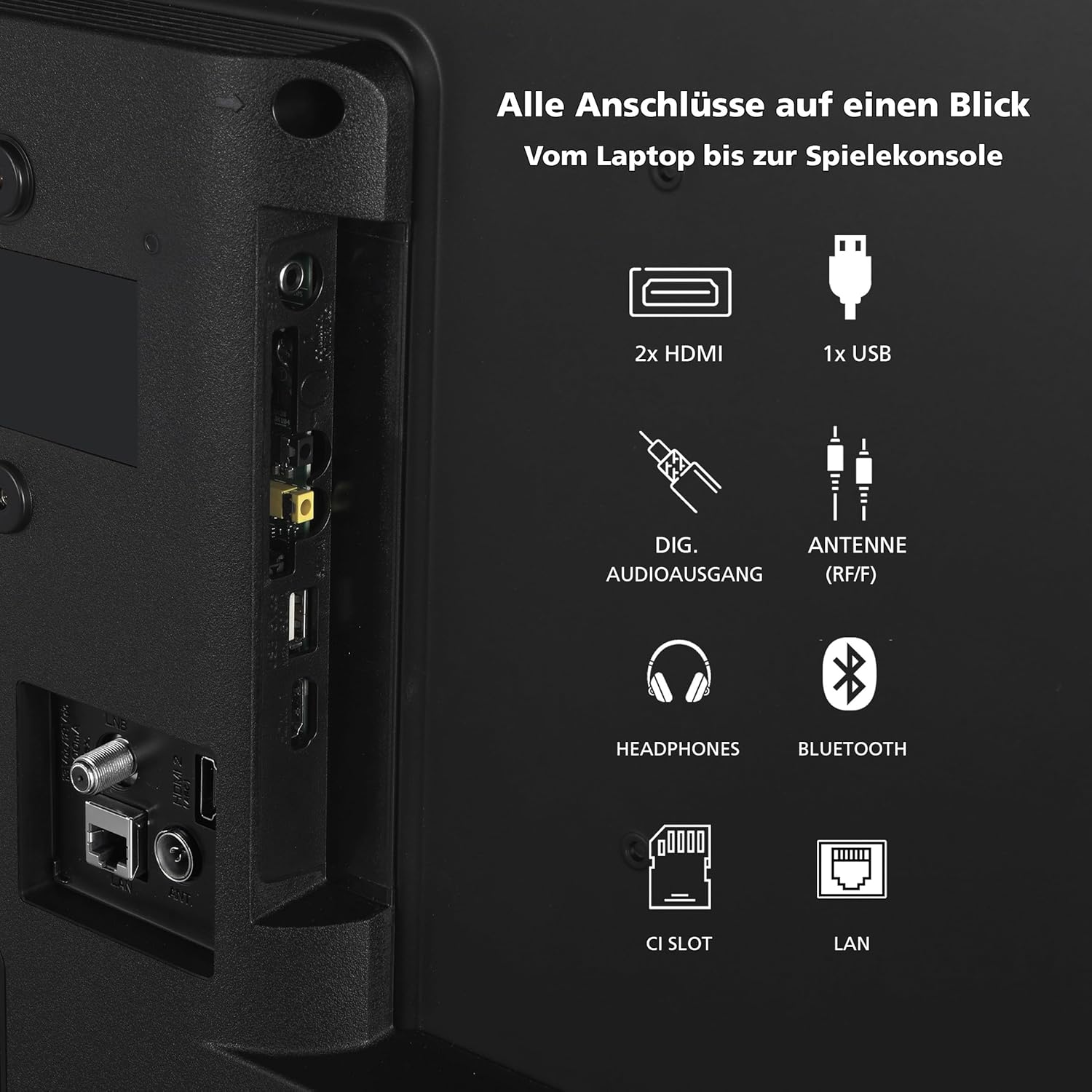 Благодарение на интегрирания троен DVB-C/T2/S2 тунер, можете да приемате телевизионни програми чрез сателит, кабел или антена директно на вашия телевизор, без да е необходим допълнителен приемник. Многобройните връзки, като например 2x HDMI (CEC + ARC), 1x USB с мултимедиен плейър за възпроизвеждане на снимки, видеоклипове или музика, CI+ и много други, осигуряват мултимедийна гъвкавост и разнообразие.