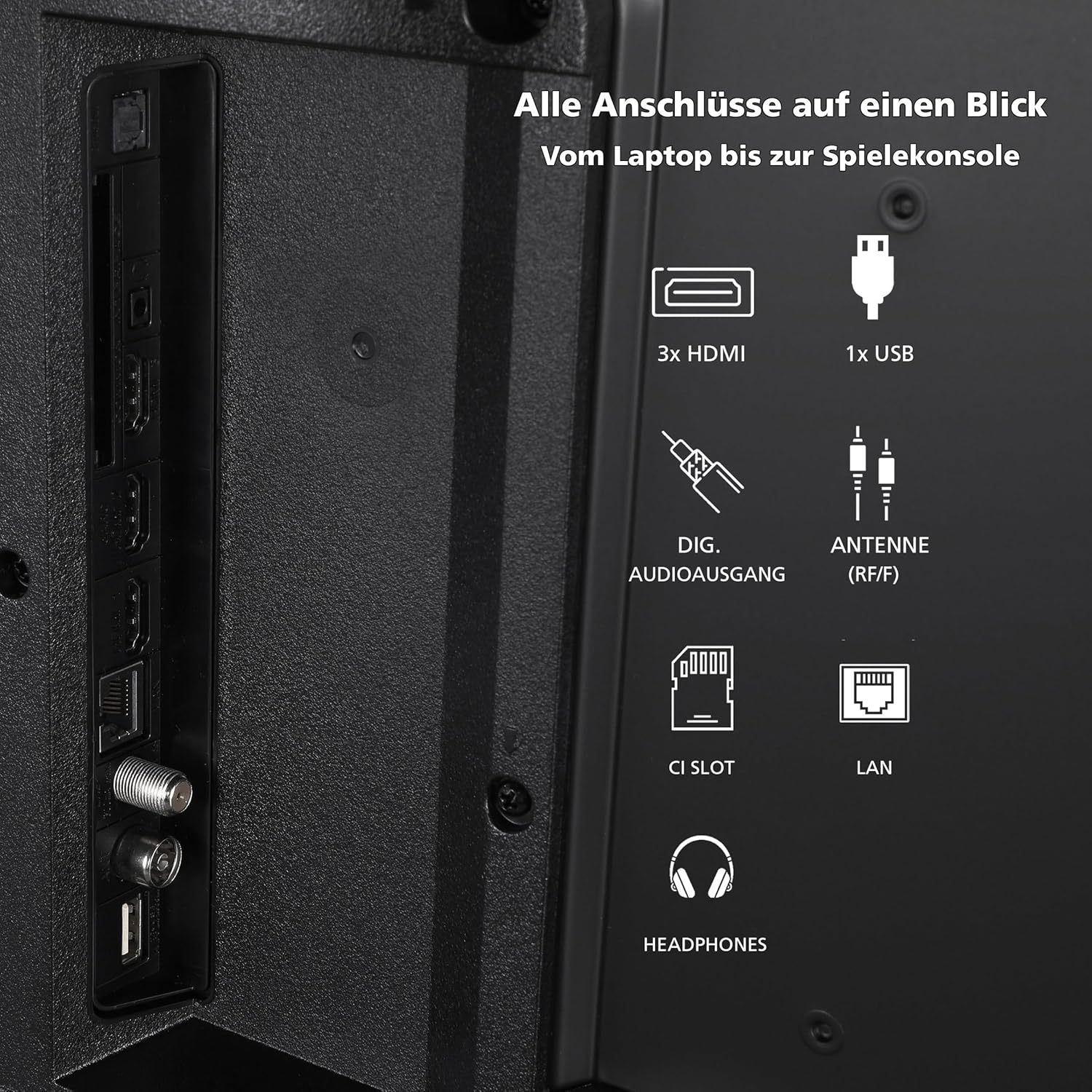 Благодарение на интегрирания троен DVB-C/T2/S2 тунер, можете да приемате телевизионни програми чрез сателит, кабел или антена директно на вашия телевизор, без да е необходим допълнителен приемник. Многобройните връзки, като например 2x HDMI (CEC + ARC), 1x USB с мултимедиен плейър за възпроизвеждане на снимки, видеоклипове или музика, CI+ и много други, осигуряват мултимедийна гъвкавост и разнообразие.