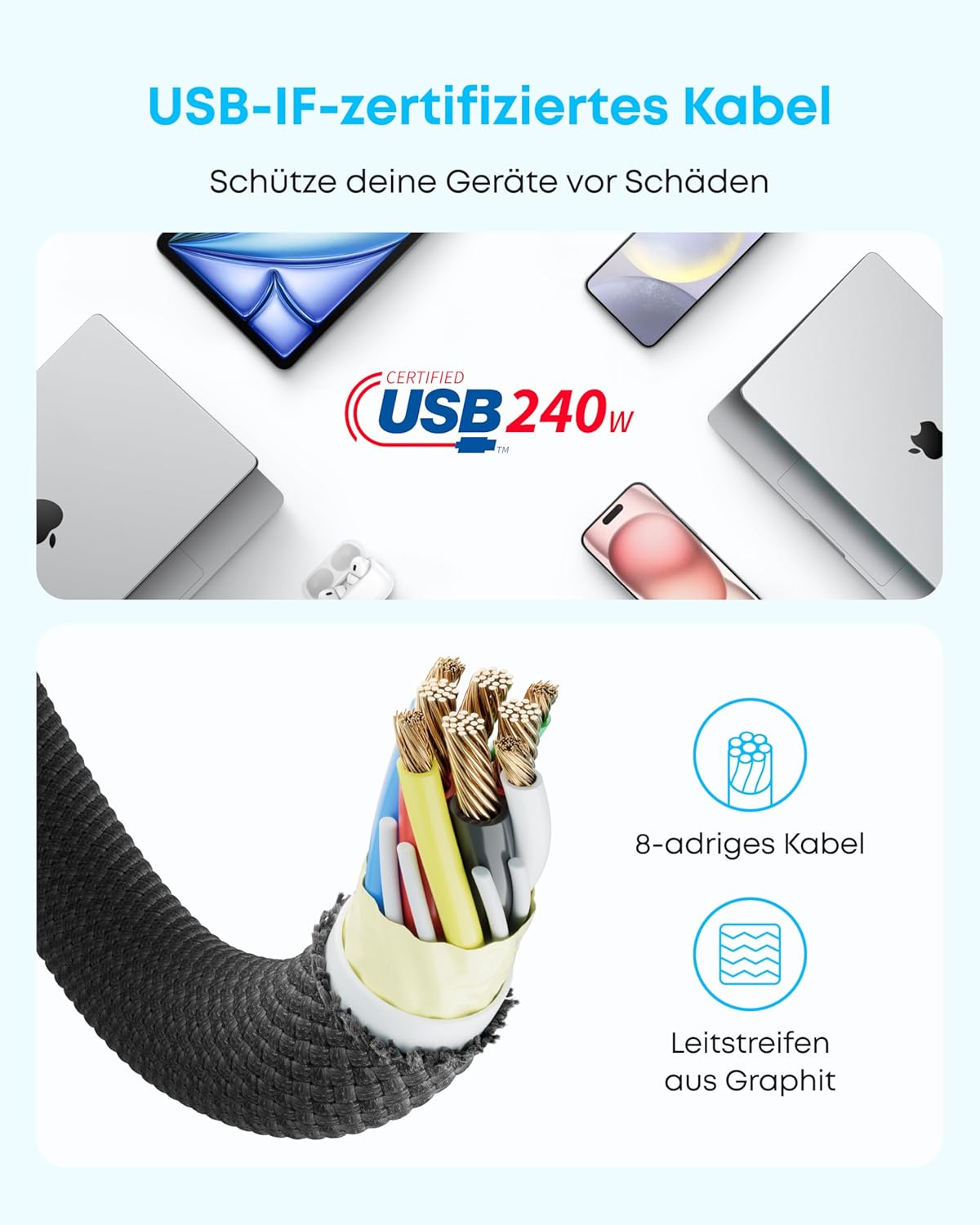 • Съдържание на кутията: Кабел Anker USB C към USB C (1,8 м, 240 W, оплетен), ръководство за бърз старт.