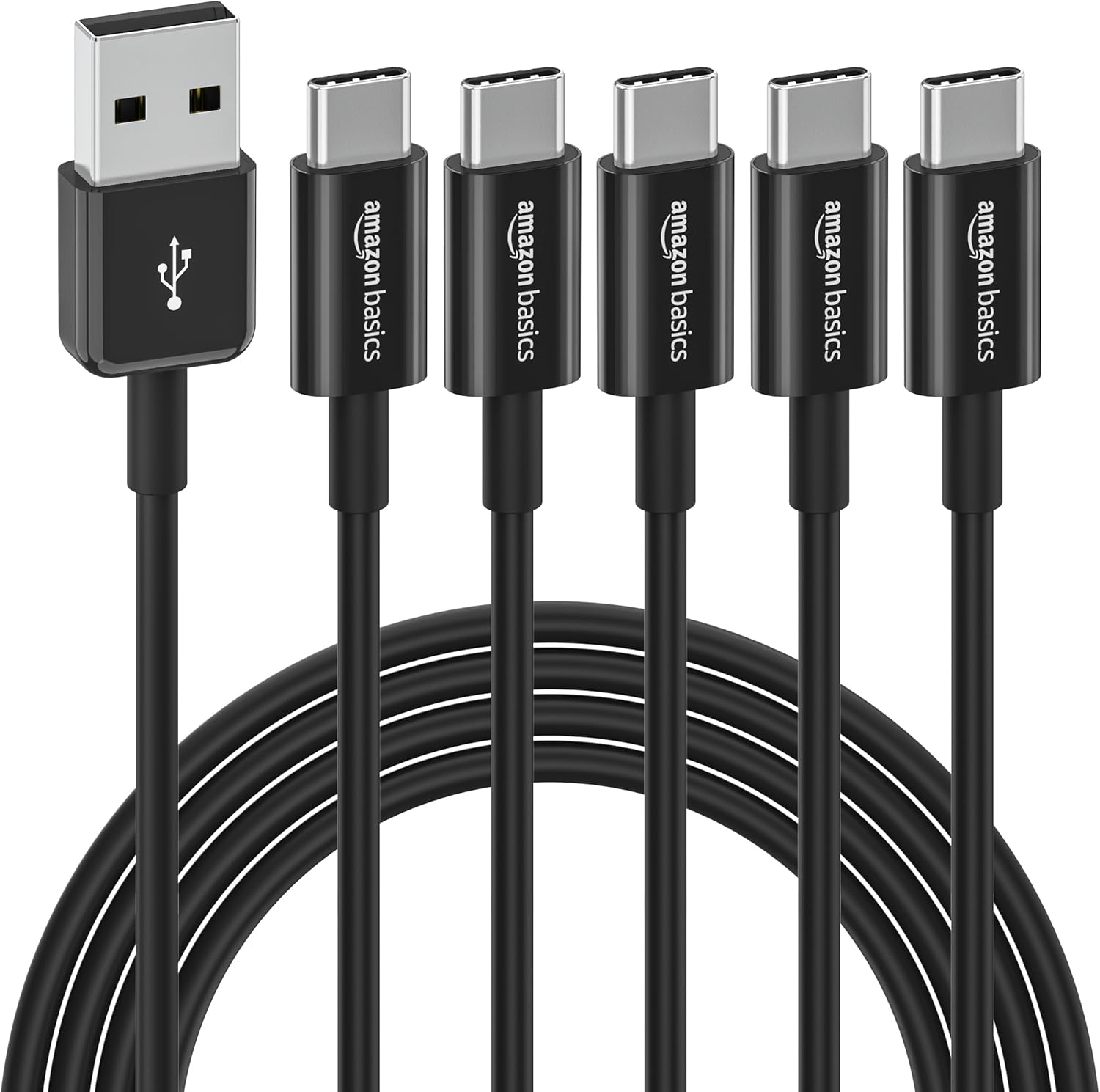 Кабел за бързо зареждане Amazon Basics USB C към USB-A 2.0, скорост 480 Mbps, USB-IF сертифициран за Apple iPhone 16/15, iPad, Samsung Galaxy, лаптопи, 1.8 м (6 фута), черен (опаковка от 5)