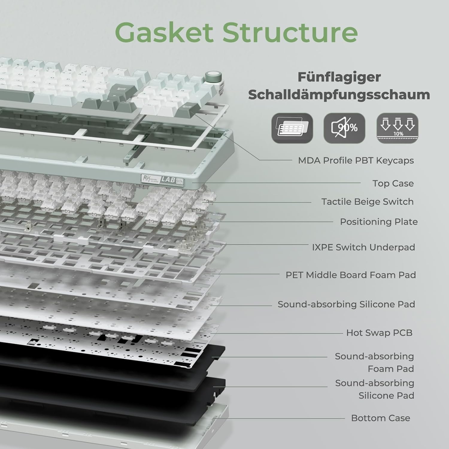 • Уплътнителна структура и предварително смазани кремообразни превключватели: кабелът на механичната клавиатура R98 впечатлява с иновативна уплътнителна структура и 5-слойна звукоизолация за по-малко вибрации и по-тихо и плавно писане. Кремообразните превключватели осигуряват бърза реакция и прецизна обратна връзка - идеални за взискателни машинописи и геймъри.