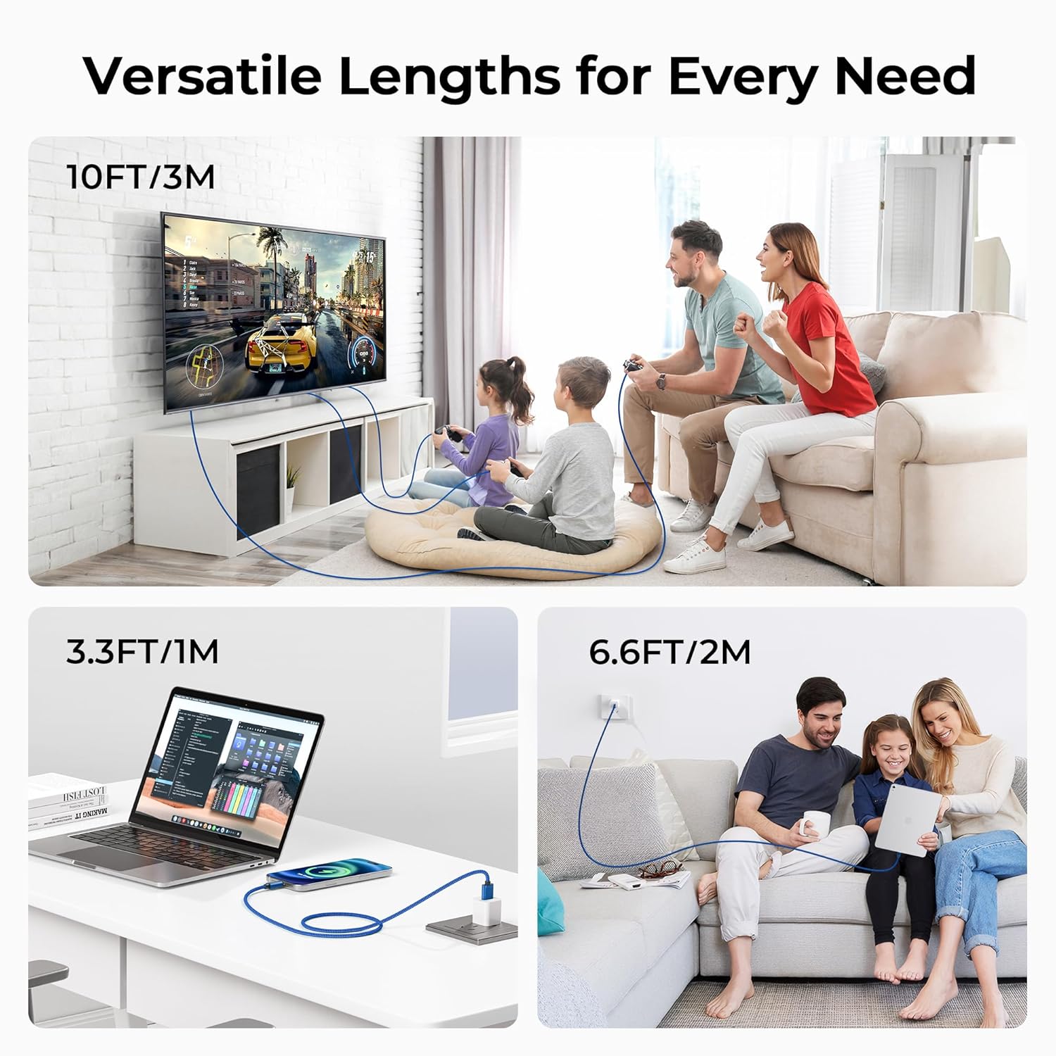 • Изключително издръжлив: Нашият продукт е издръжлив и здрав кабел, на който можете да разчитате, с двойно оплетена външна част и висококачествена сърцевина от арамидни влакна. Той е издържал над 7000 теста за огъване, което му позволява да издържи на ежедневно износване. Конекторите от алуминиева сплав също имат подсилени шийки, за да се намалят щетите, причинени от огъване.