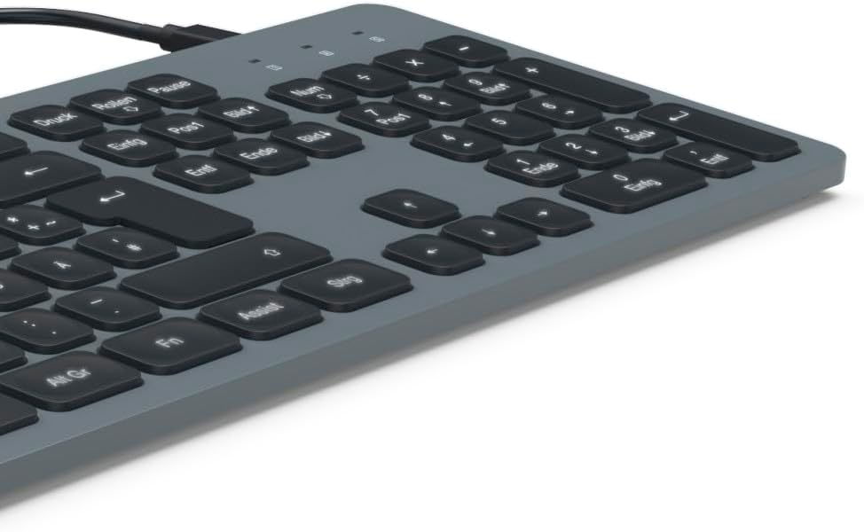 • USB клавиатура с кабел: сменяем USB кабел, идеален, ако кабелът се нуждае от смяна, включва велкро кабелни връзки, за да се избегне заплитане на кабели на бюрото, клавиатура с пълен размер и цифров блок „plug & play“