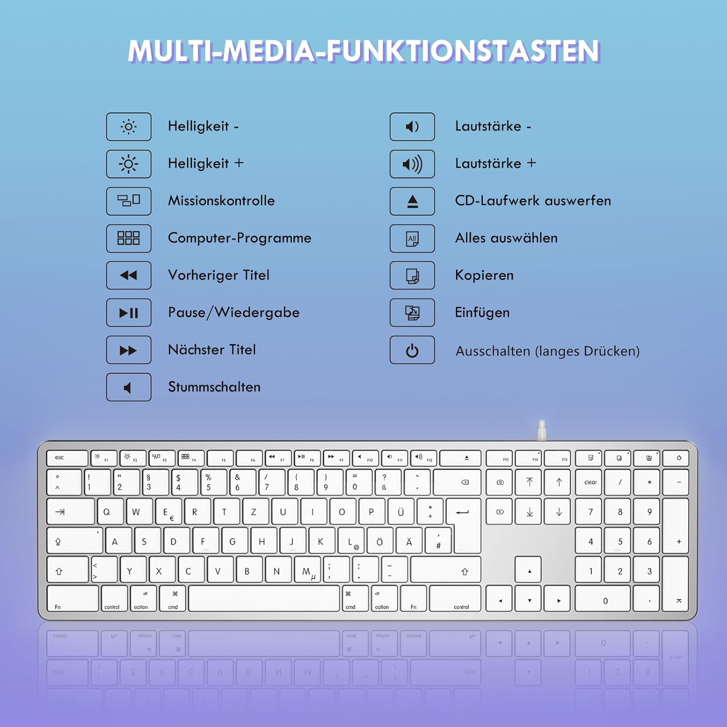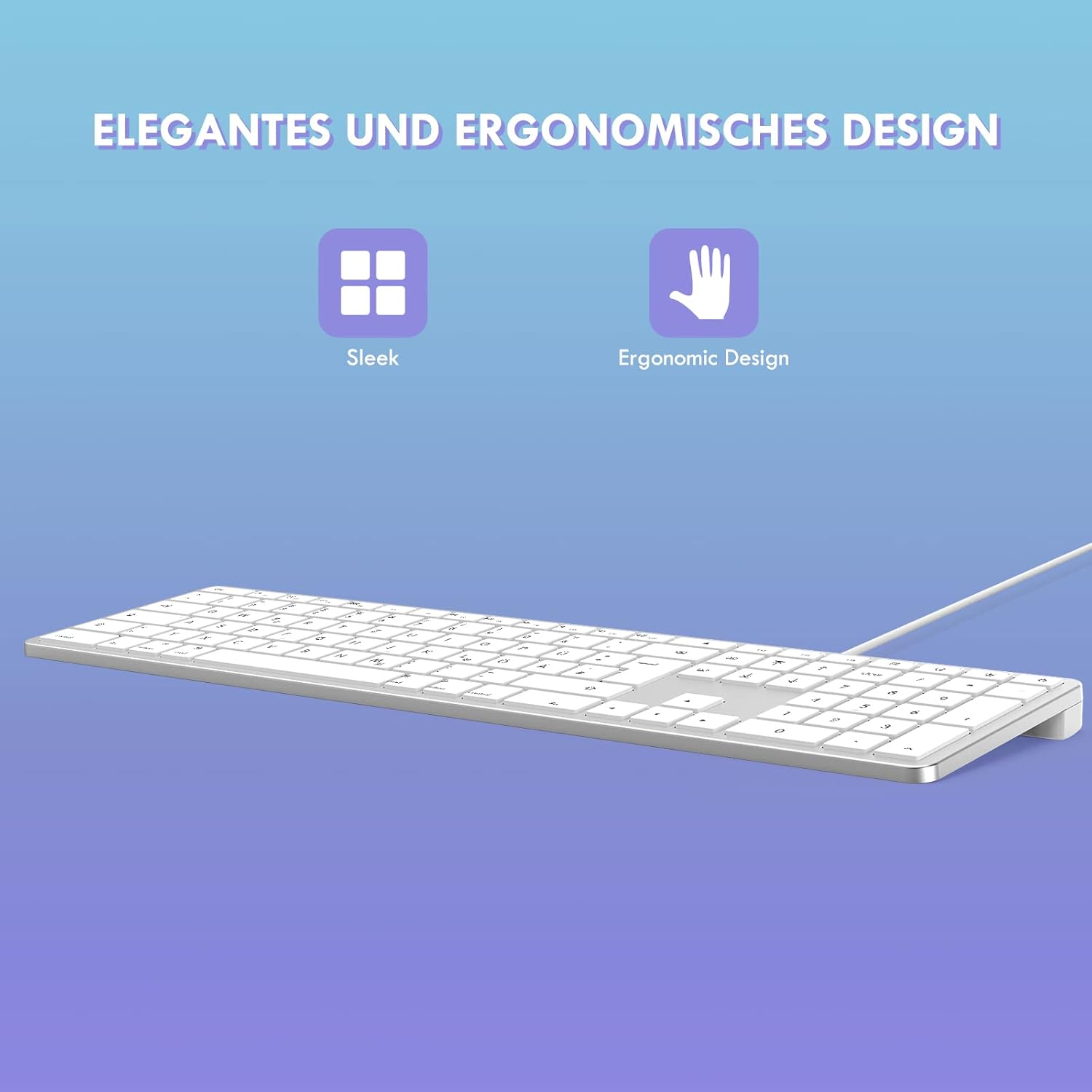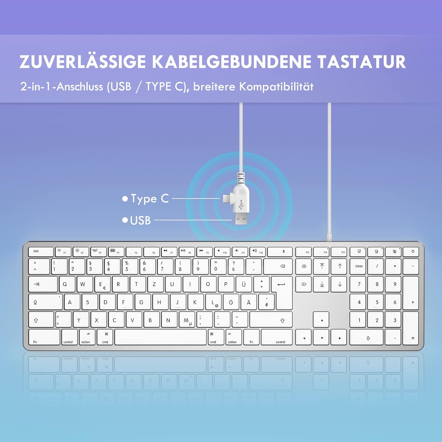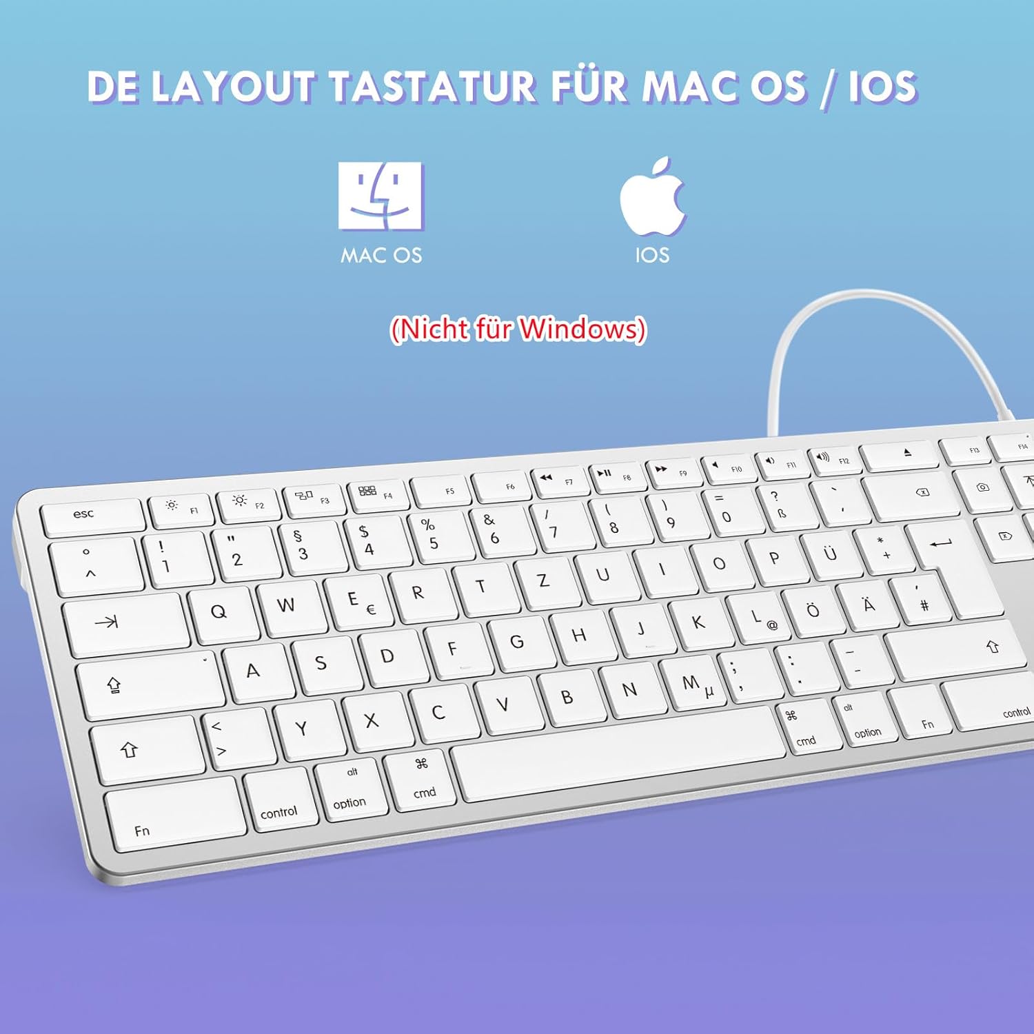 Кабелна клавиатура за Mac Seenda, с кабел и Type-C/USB порт, немска QWERTZ клавиатура за iMac, само за Mac OS/iOS, сребриста и бяла