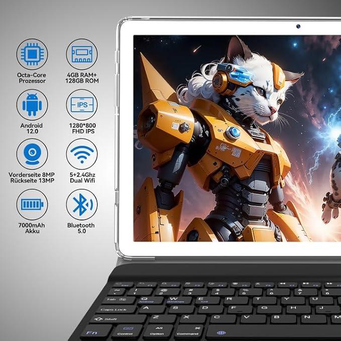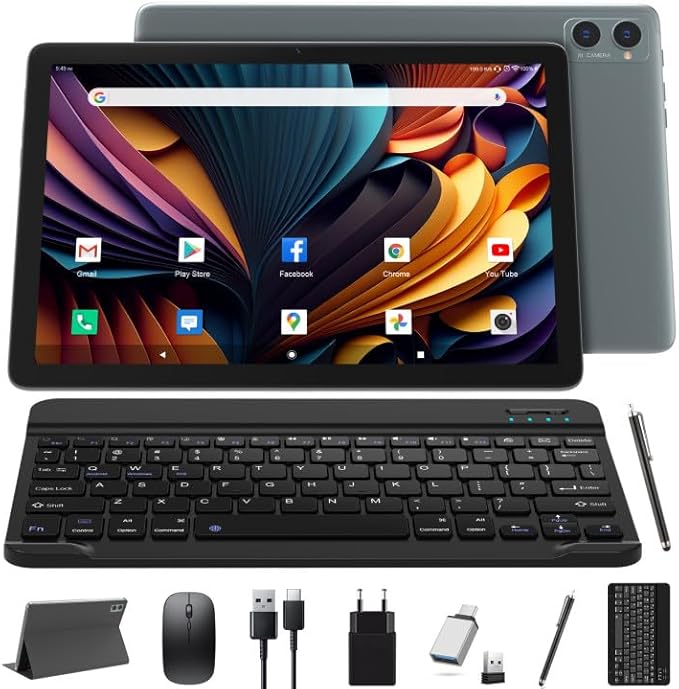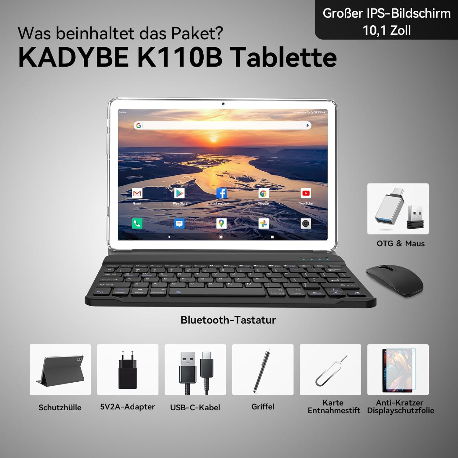 KADYBE 2025 Най-нов Android таблет 10 инча, 128GB ROM (1TB TF), Octa-Core, 1080 FHD, разпознаване на лица, 8+13 MP, 1.8GHz, 7000 mAh, таблетен компютър с клавиатура, мишка и стилус, Type-C (сребрист)