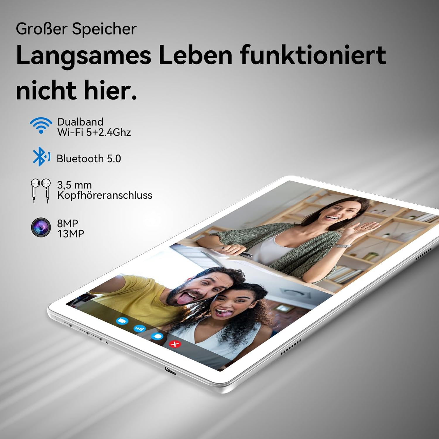 • 10,1-инчов таблет с 13MP камера: HD 1280 x 800 IPS сензорен екран със съотношение 16:10, широк ъгъл на видимост от 178 градуса и живи цветове. Разполага с 13MP задна двойна камера + 8MP предна камера за снимки и HD видео разговори. Този 10+-инчов таблет разполага с двойни стерео високоговорители с регулируема яркост на екрана, тъмна тема и режим за защита на очите, за да се предотврати напрежението в очите. Той също така разполага с 3,5 мм жак за слушалки и FM поддръжка (от 65 MHz до 108 MHz).
