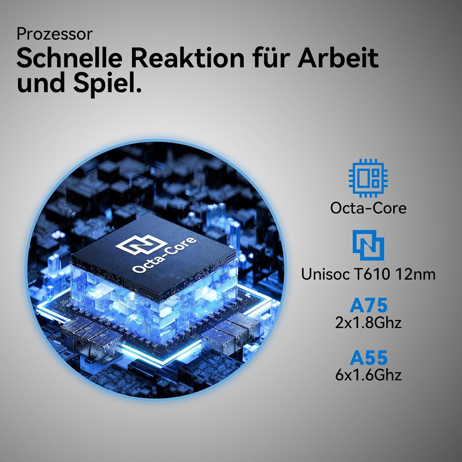 • 【По-добър осемядрен процесор】UMS512 T610 е осемядрен процесор от ново поколение (с по-добра производителност от Unisoc Tiger T606 и SC9863A). В сравнение с конвенционалния 8-ядрен процесор, скоростта на реакция е по-бърза, изображението е по-ясно, няма забавяне при обработката на графиката в играта и консумацията на батерия е по-ниска. Можете лесно да играете 3D игри като Clash of Clans и други на този 2-в-1 таблет.