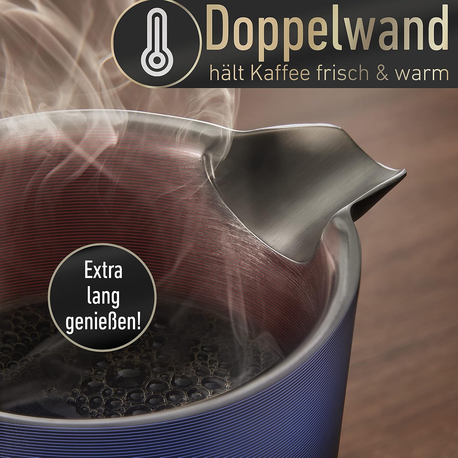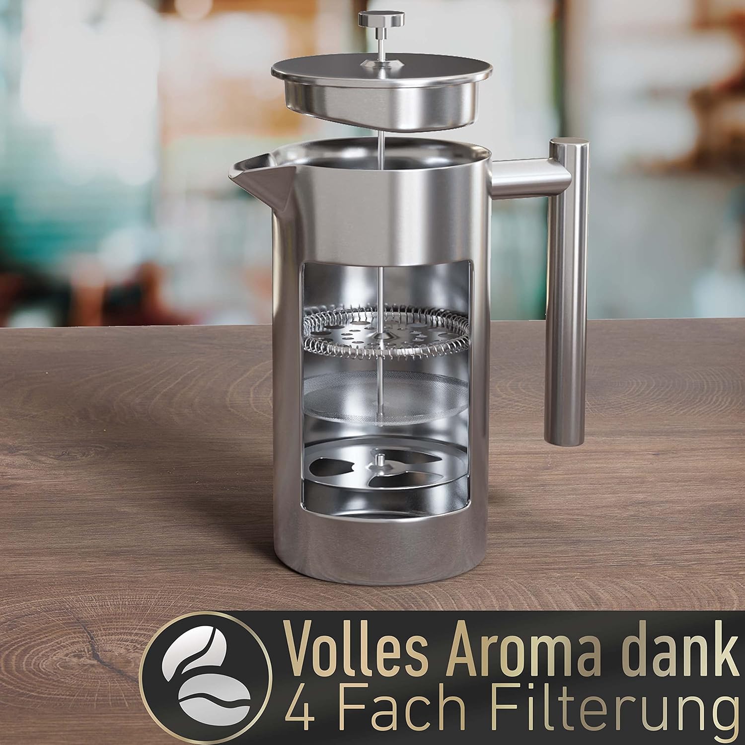 • Перфектно изолирана: нашата двустенна френска преса запазва кафето ви топло за по-дълго време благодарение на особено широкото си пространство! Изключително здравата изолация ви гарантира перфектна свежест с всяка глътка.
