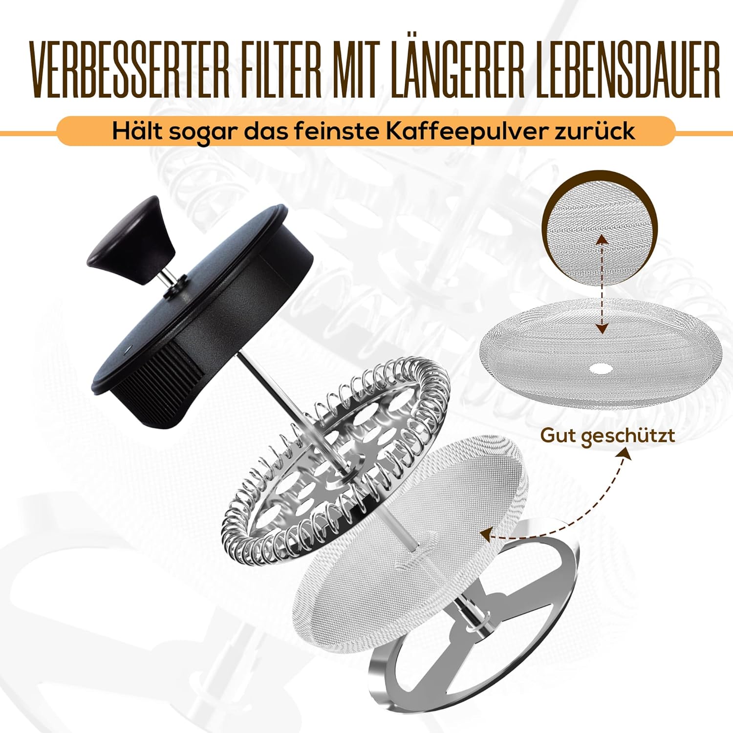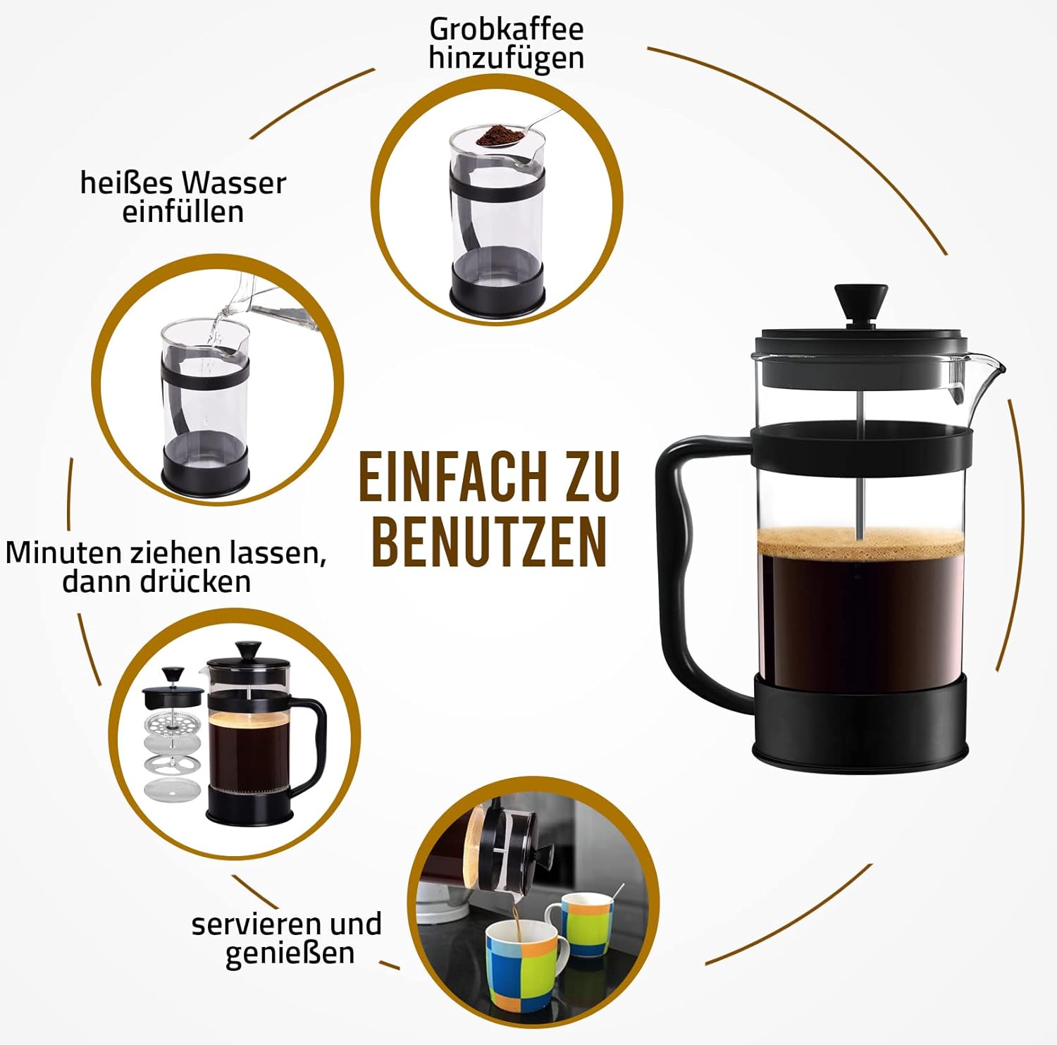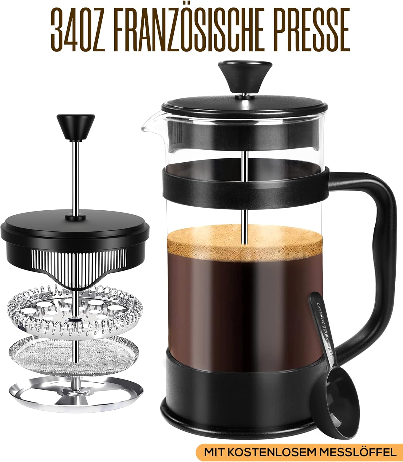 Кафемашина Kichly с филтър от неръждаема стомана, система за френска преса, кафе машина, черна, 8 чаши (1 литър/1000 мл)