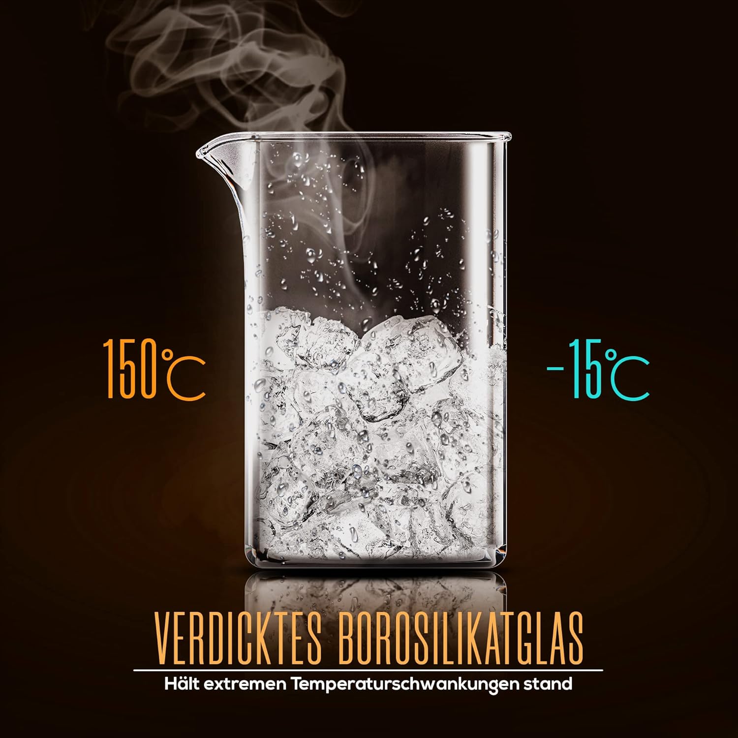 • Здрава, топлоустойчива чаша от боросиликатно стъкло е поставена в стилни изолирани пластмасови рамки, които улесняват наливането на кафе и предотвратяват клатушкането.