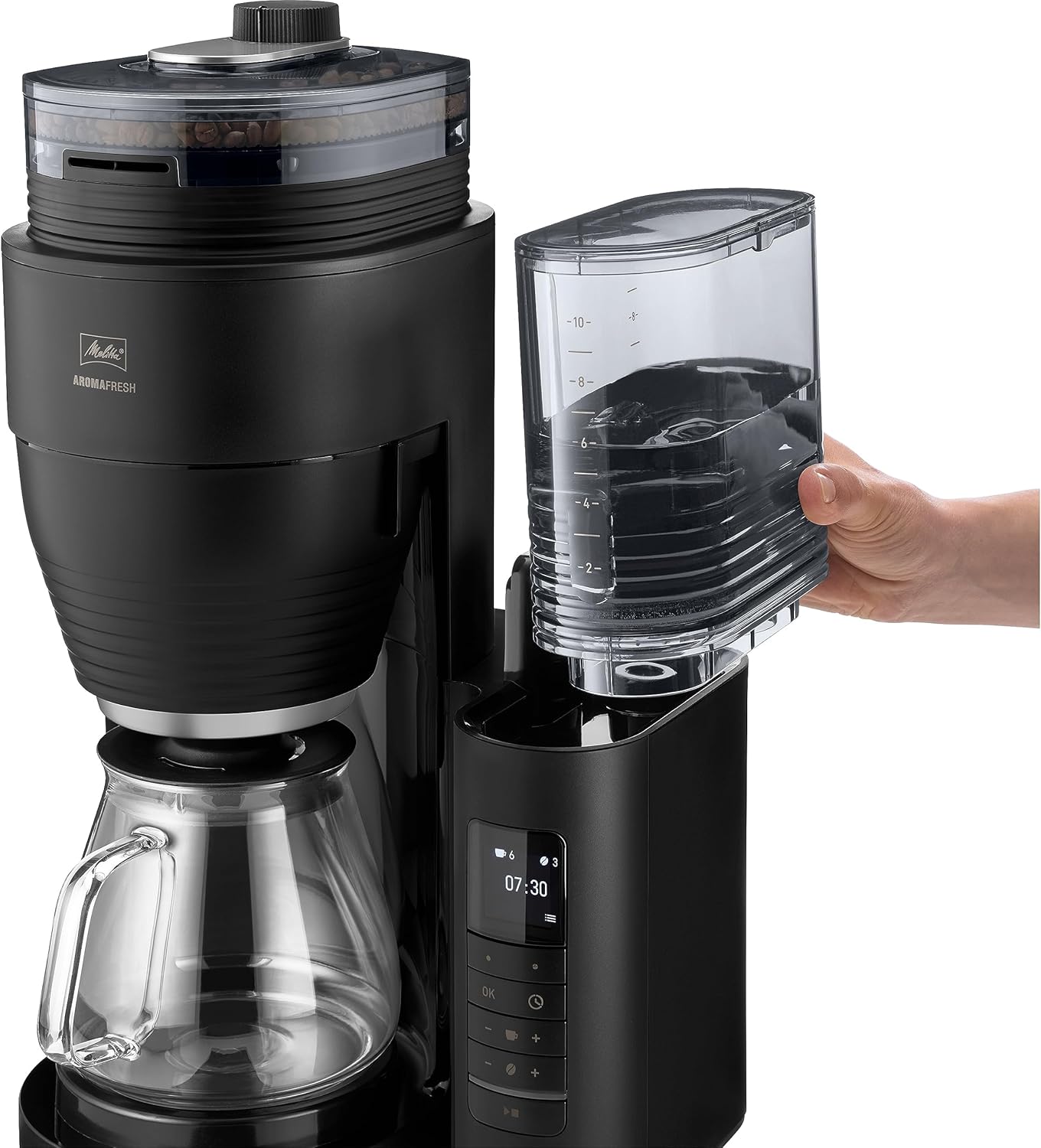 Кафемашина Melitta AromaFresh Pro X с мелачка, филтърна кафемашина със стъклена кана и подвижен резервоар за вода, за до 10 чаши кафе, черна/сребриста