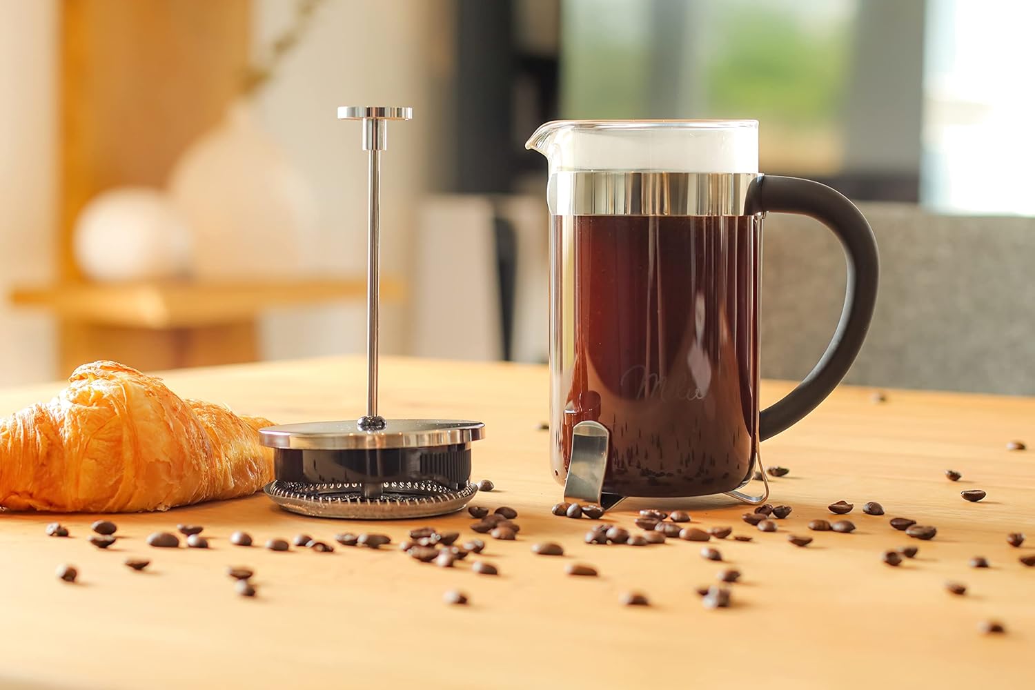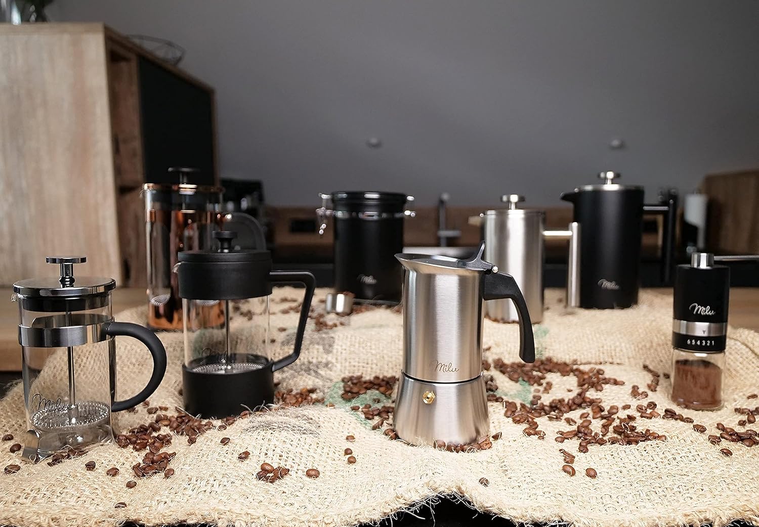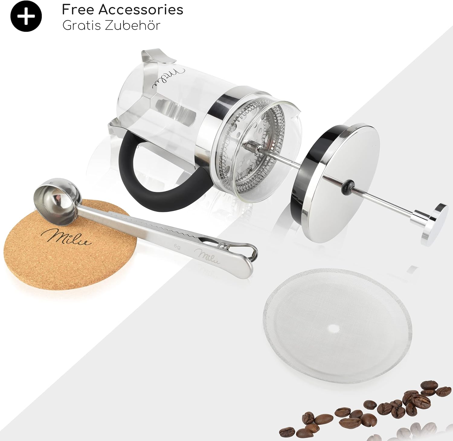 Кафемашина Milu French Press, 350 мл, 600 мл, 1 л, стъклена преса за кафе, кафемашина за дома, пътуване, къмпинг, включва подложка, лъжица, резервен филтър (неръждаема стомана, 350 мл (2 чаши)