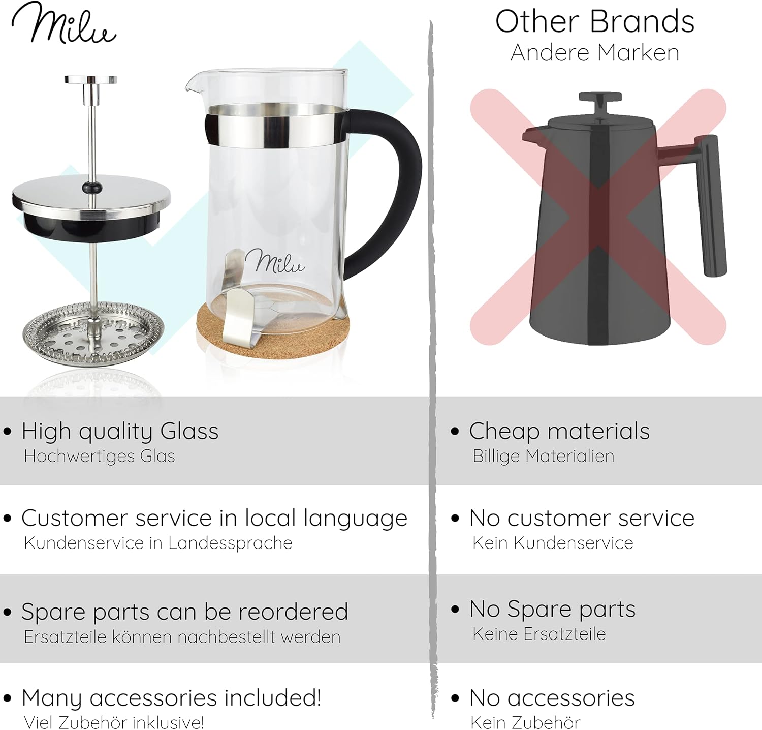 • У дома и в движение: нечупливото стъкло в пластмасов корпус прави вашата френска преса Milu не само истинска забележителност във вашата кухня, но и много здрава за вашите приключения и екскурзии.